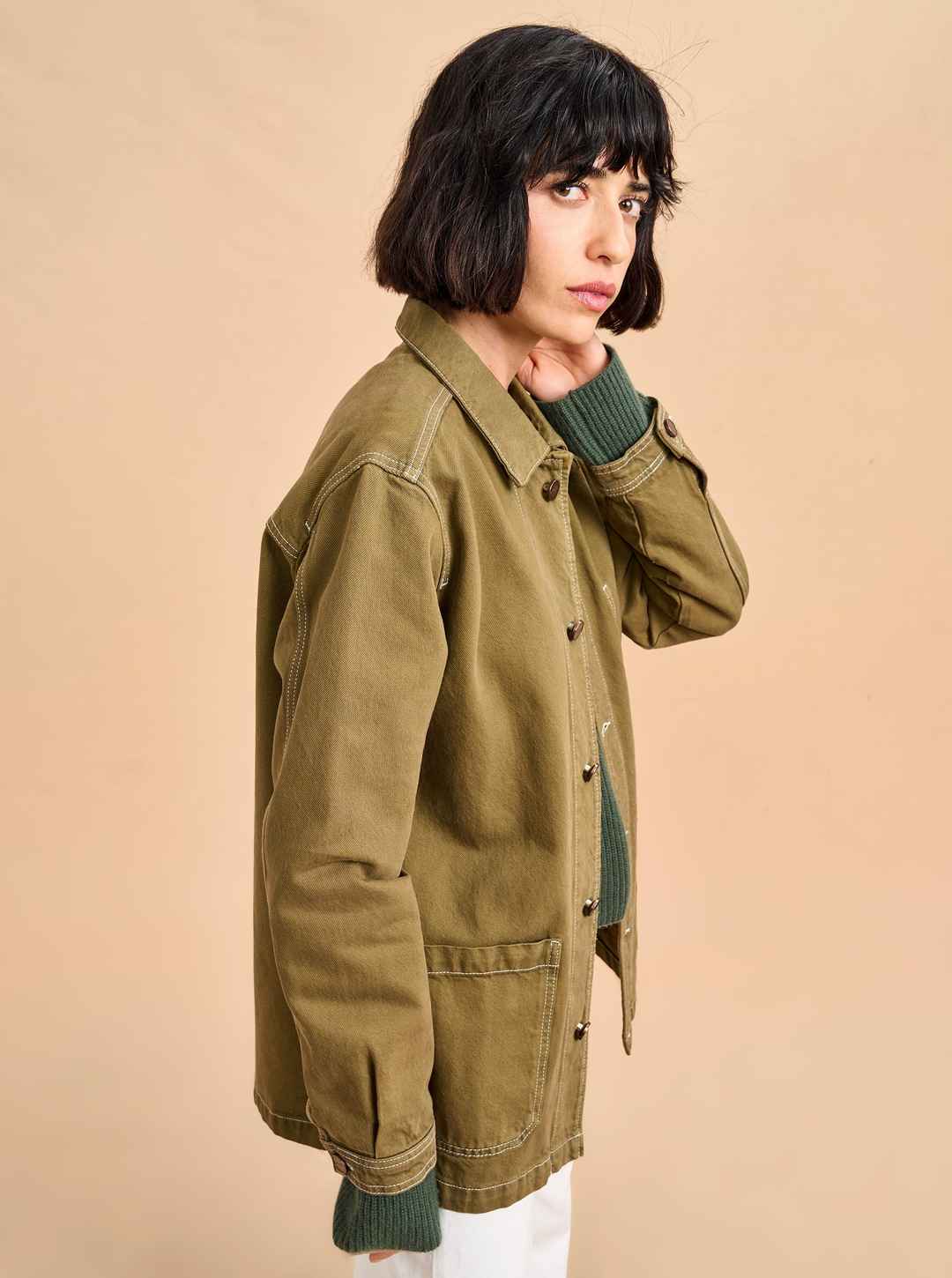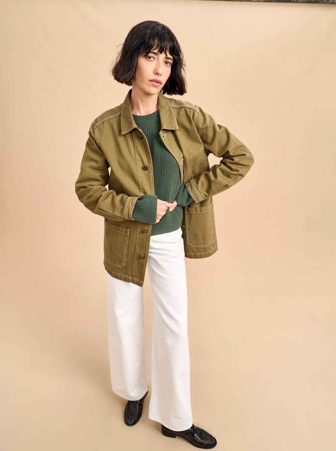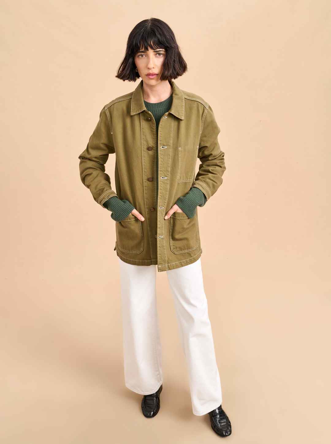 Based on the classic French painter jackets, this one in non-stretch, khaki denim is oversized to go over a knit and an easy winner when paired back to denim.