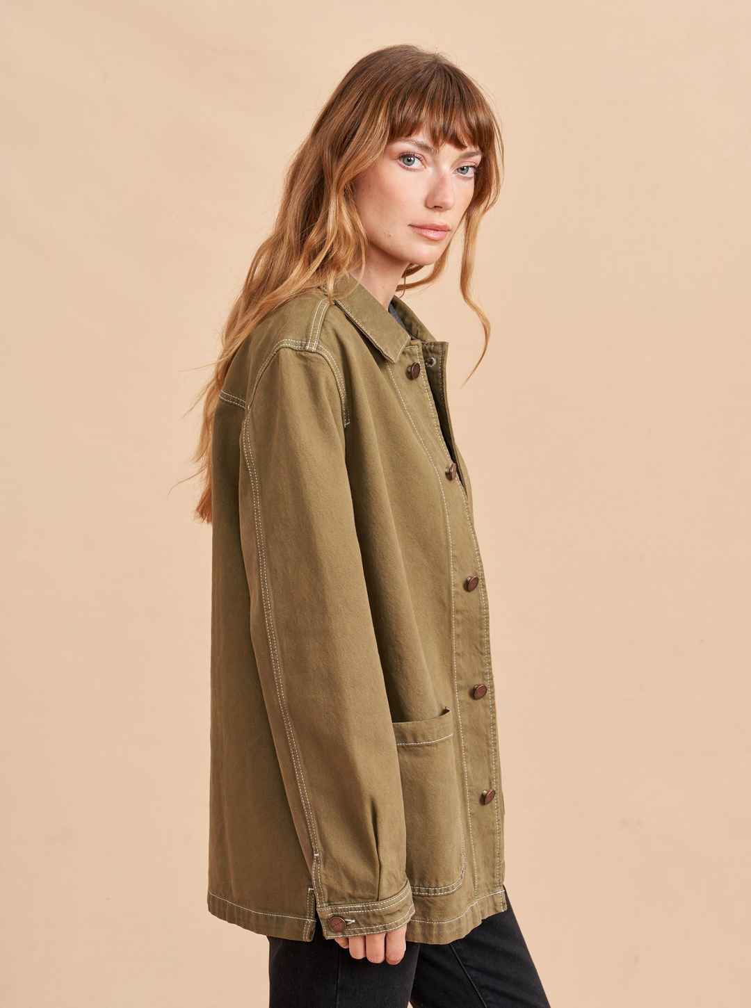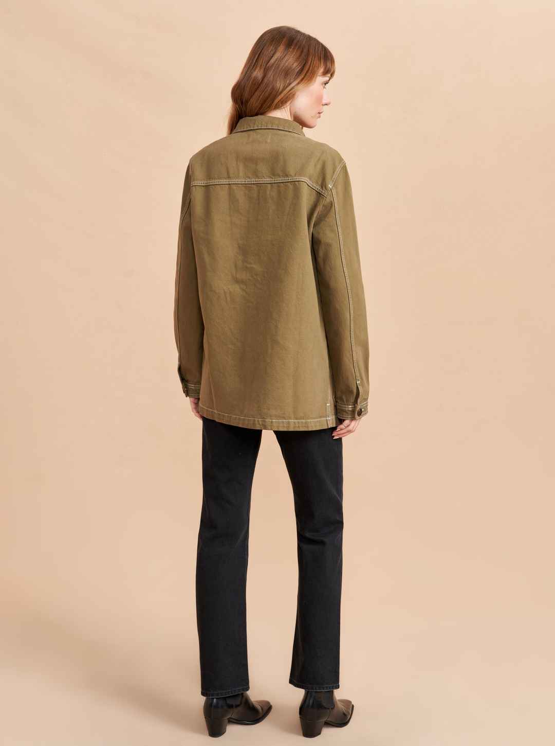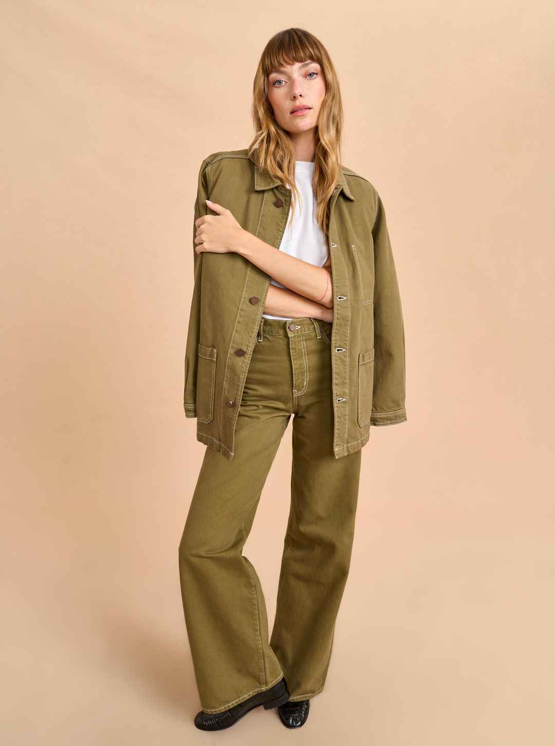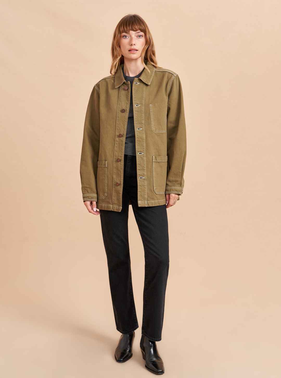 Based on the classic French painter jackets, this one in non-stretch, khaki denim is oversized to go over a knit and an easy winner when paired back to denim.