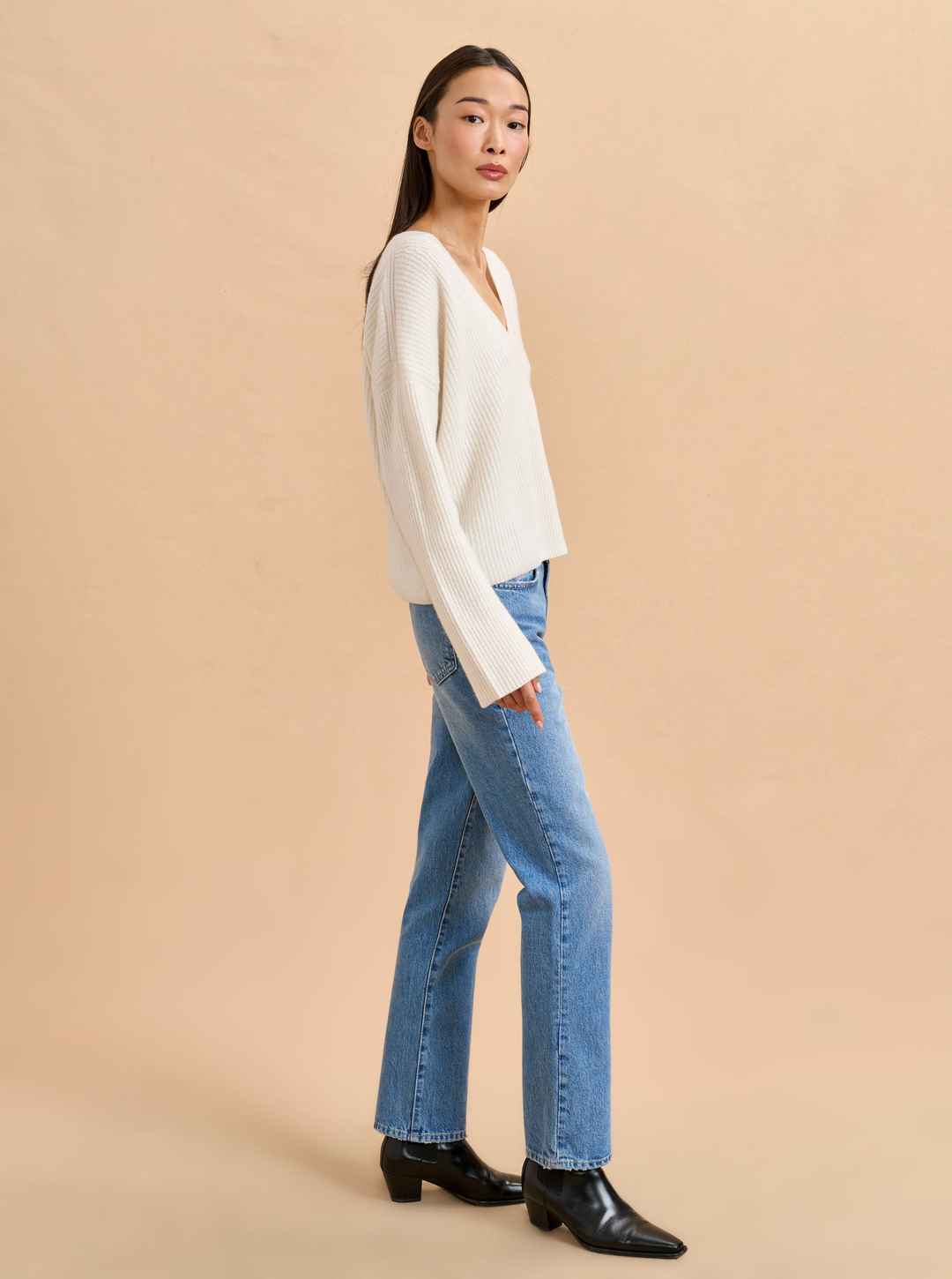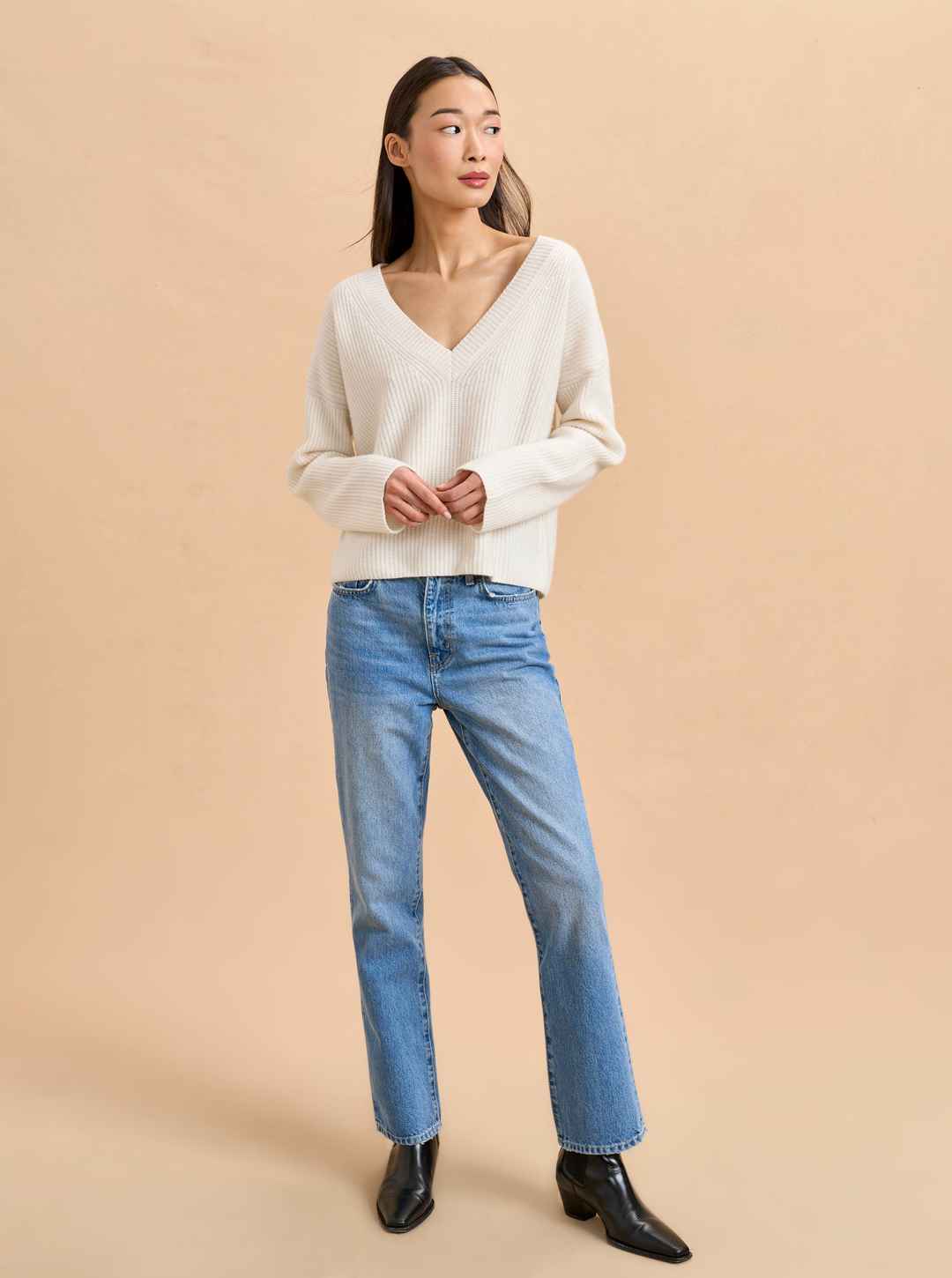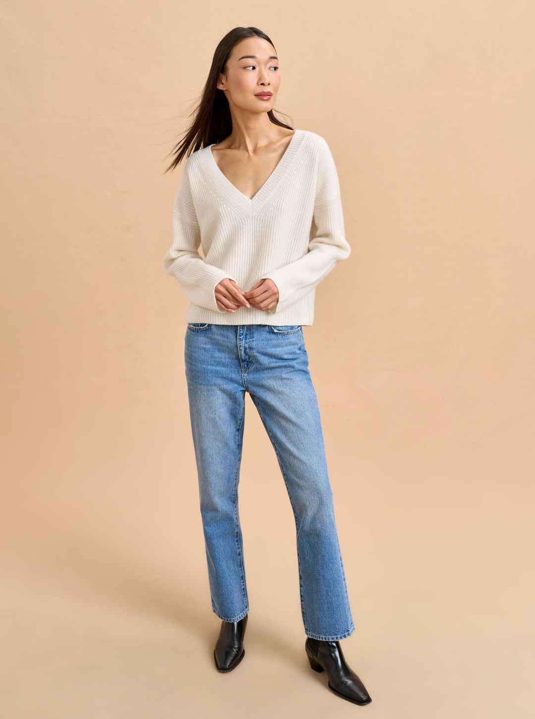 This is it. This is your everyday, never-without, take-with-you-everywhere sweater that will always have your back. Deliciously ribbed cashmere with a plunging v-neck and slightly cropped silhouette means you need one in every color for tous les jours.