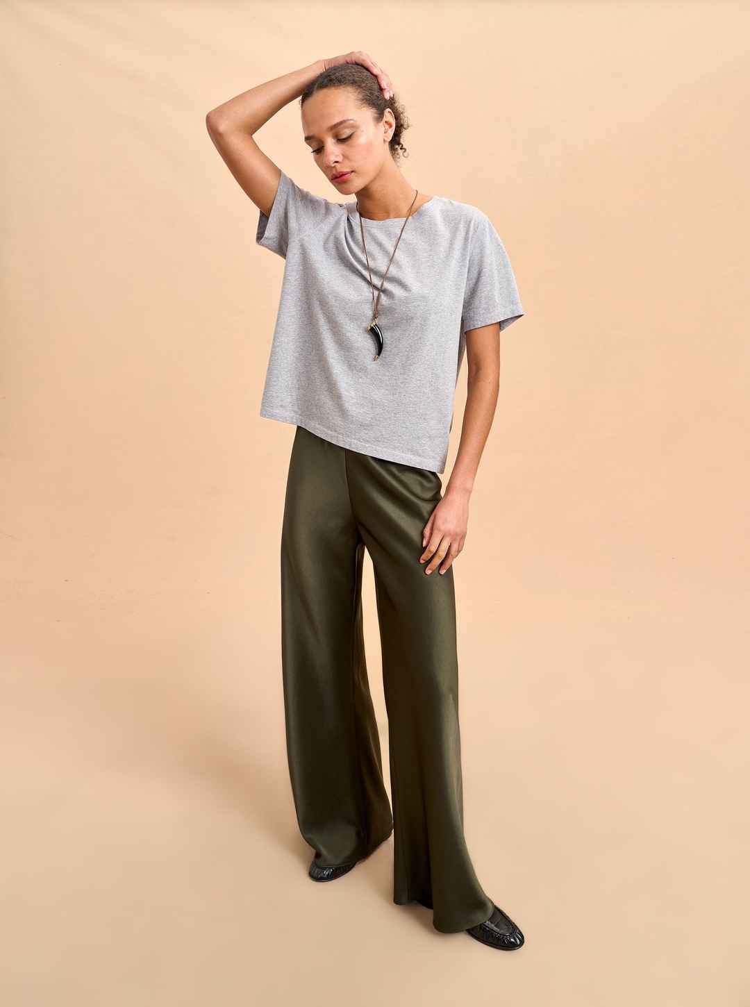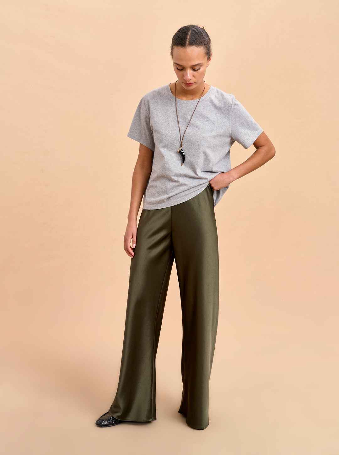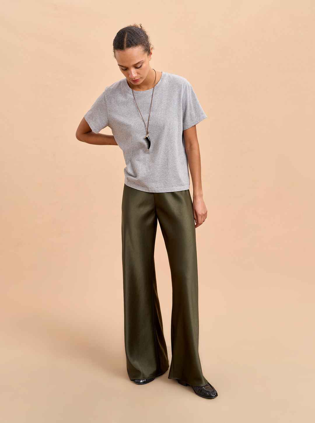 Easy elegance lives here. The Colby relaxed fit satin wide leg are bias cut for an elevated pull-on feel. Think the polish of your best slacks with the comfort of sweats. These olive green satin pants pair effortlessly with cashmere, lace, or even your silkiest slip for a refined look.