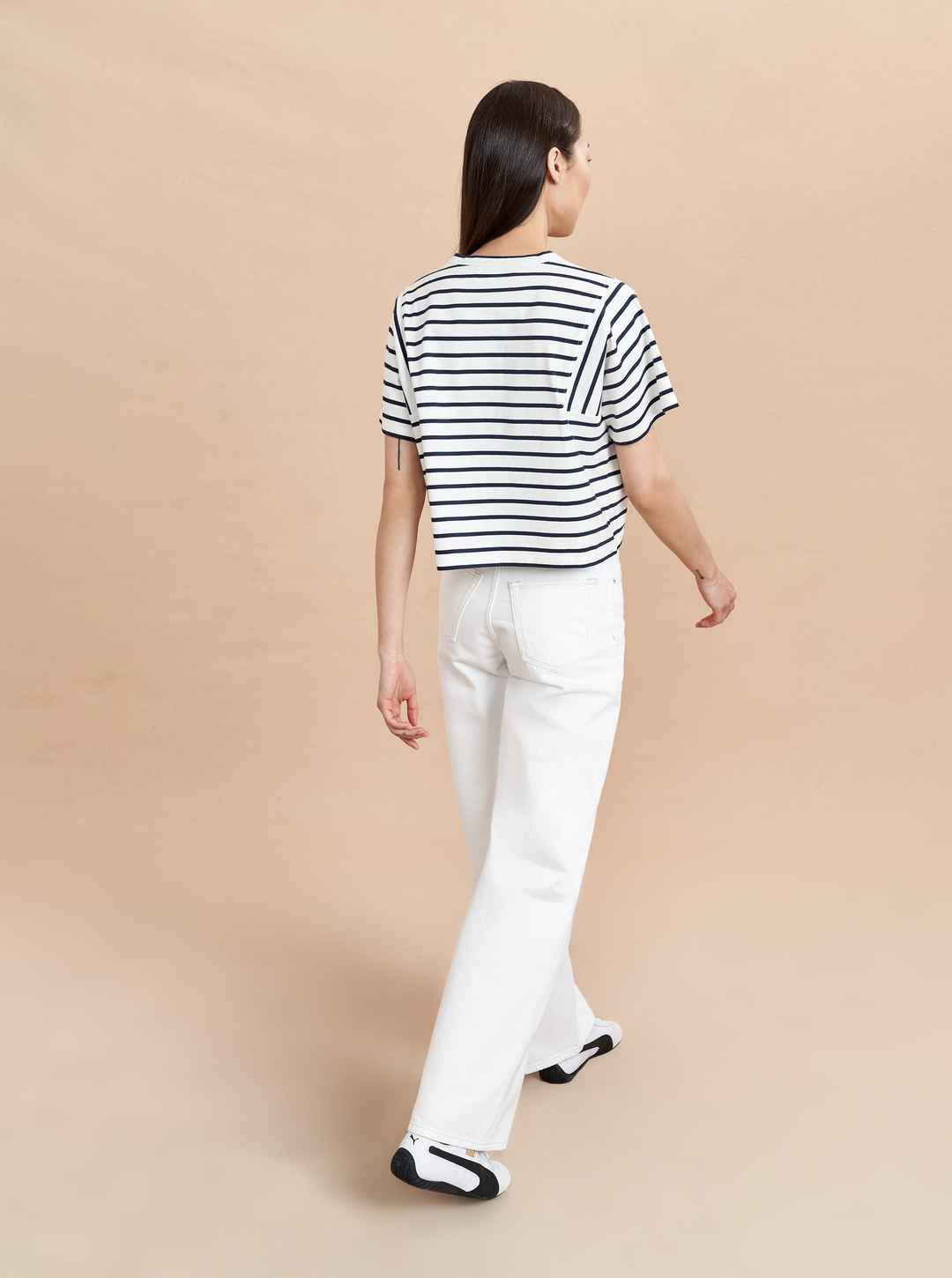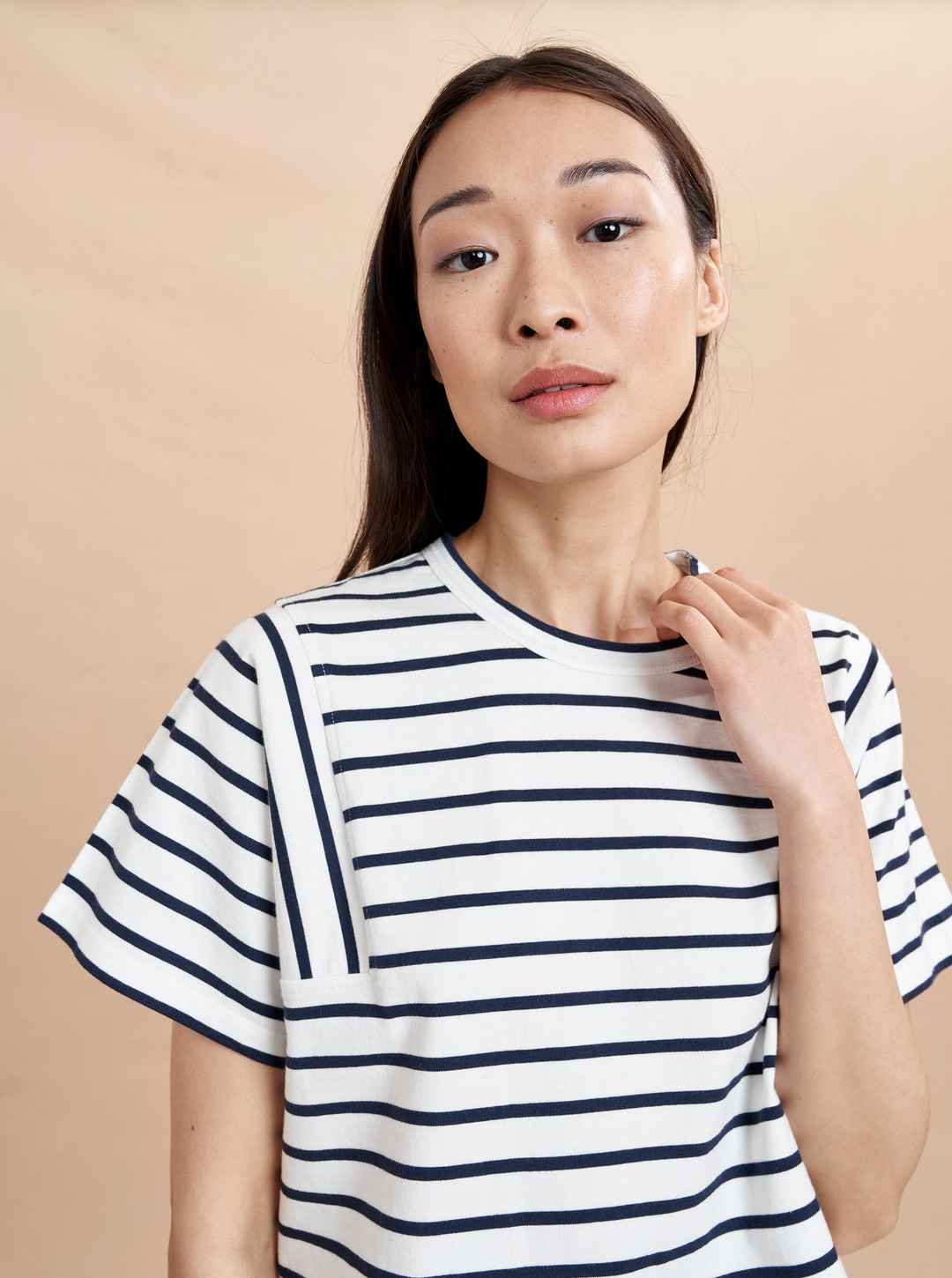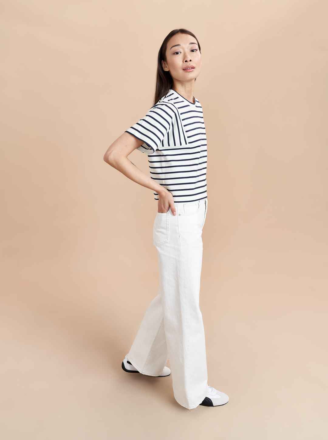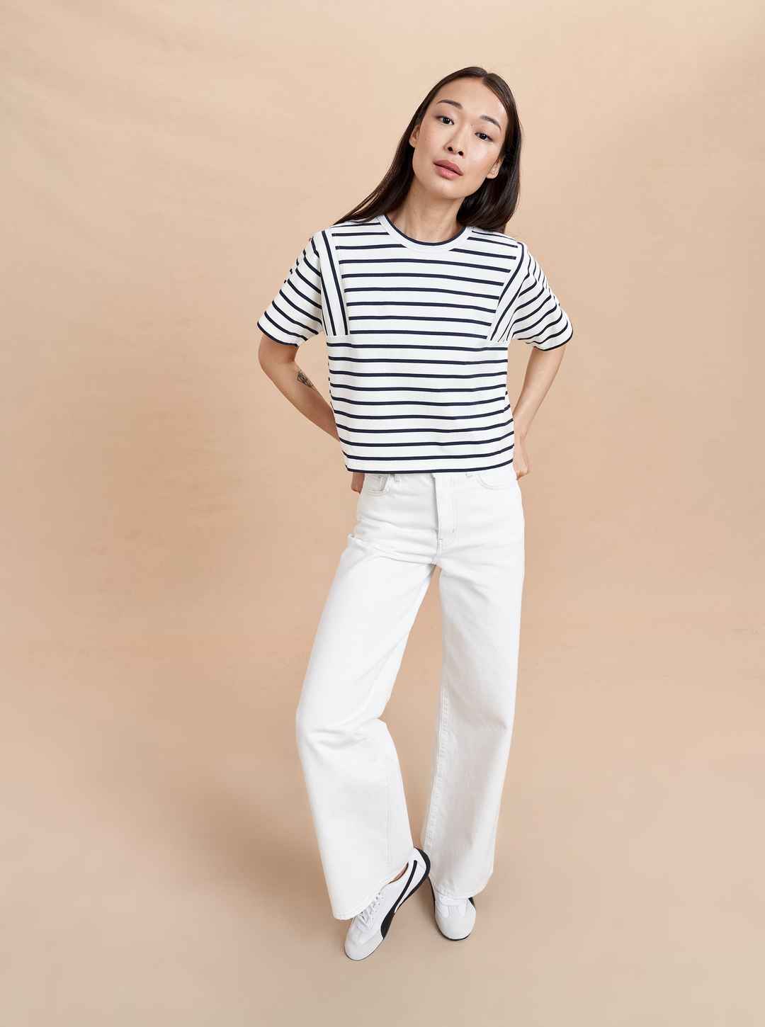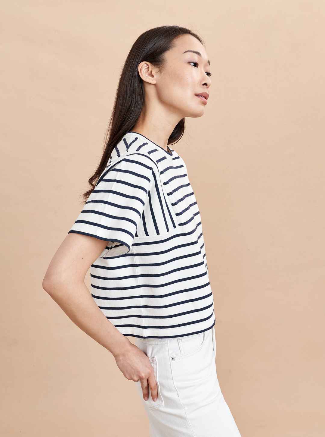 An updated take on a classic, this Breton-striped style features a square armhole shape with vertical stripes and cropped, boxy fit. FINAL SALE