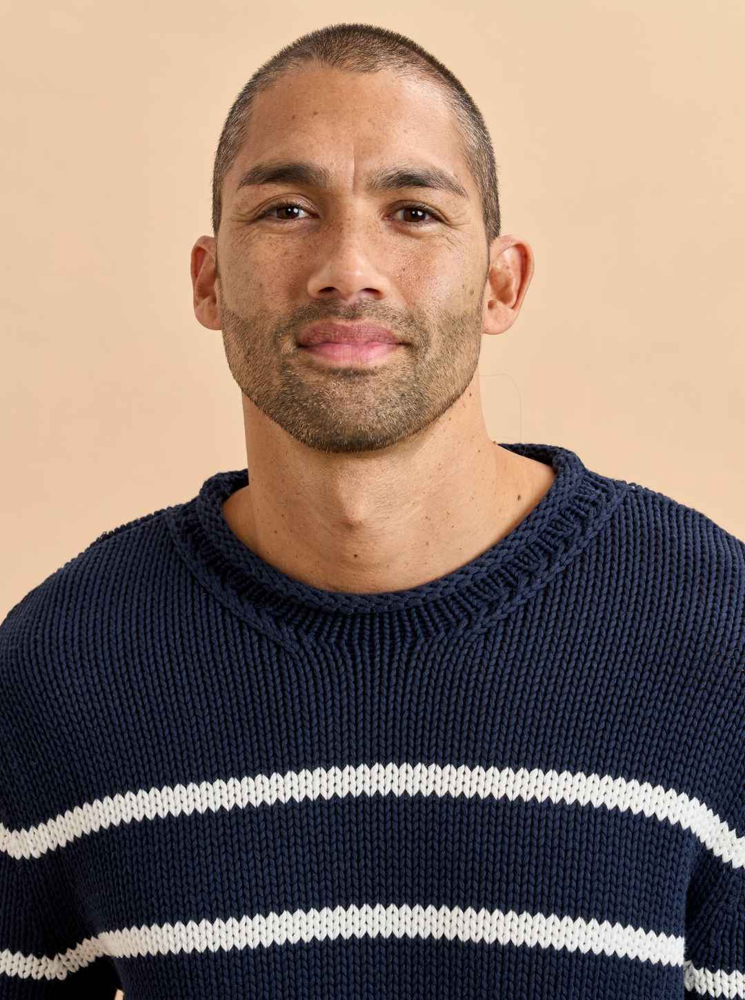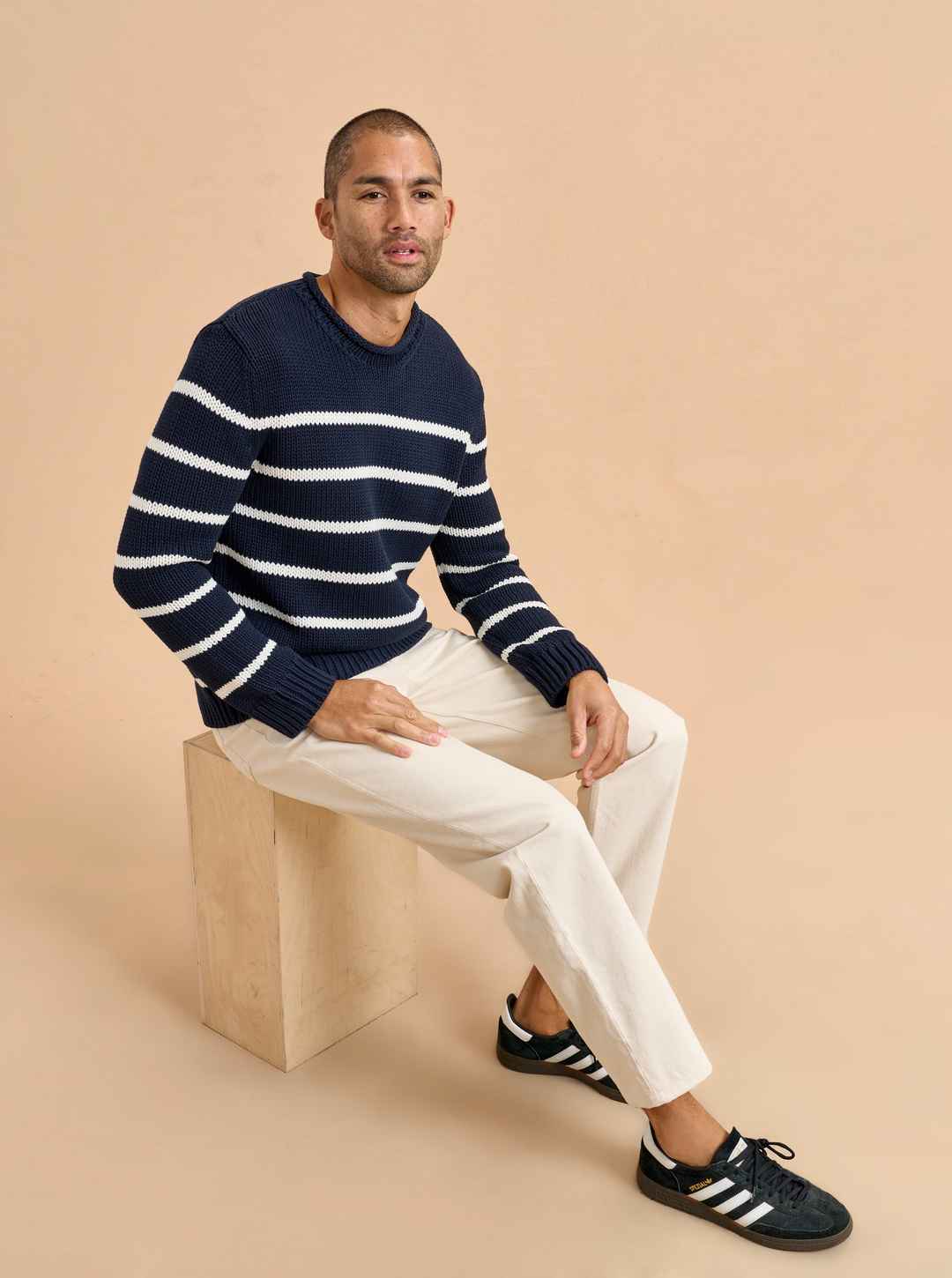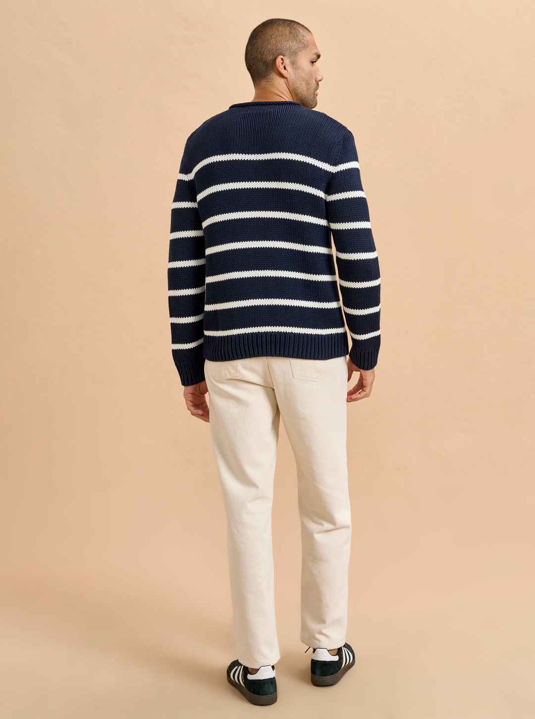 Our best-selling Marina Sweater just got a lot better. Get your loved one on board with our men's version in navy with cream stripes in 100% comfy cotton. Give him the gift that keeps on giving. Featuring the AWAY Bigger Carry-On in Spritz & Cabana.