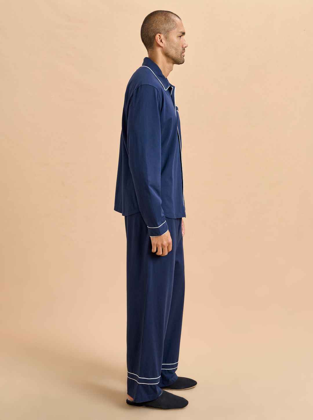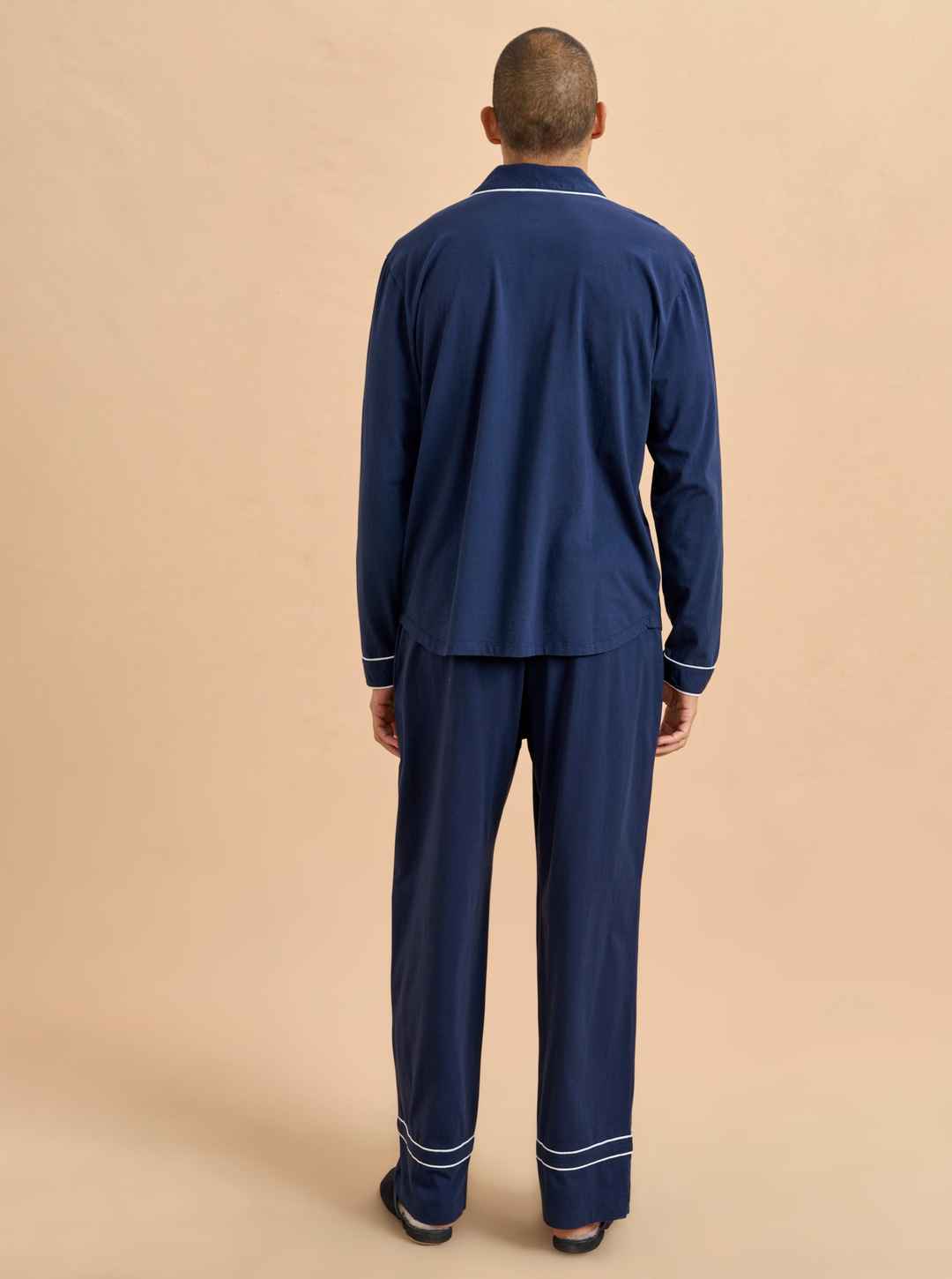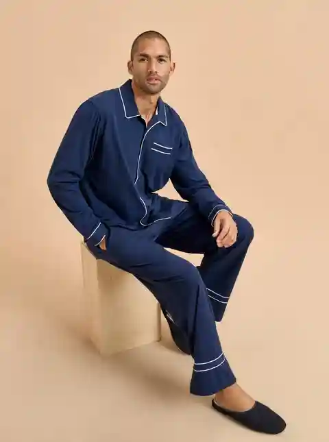 Now the favorite men in your life can join in the pajama party fun. Our men's version is cut from the same super soft t-shirt fabric for the ultimate in comfort. Navy blue cotton PJs framed with contrasting white piping, this set is comprised of a relaxed-fit top and elastic waistband pant.