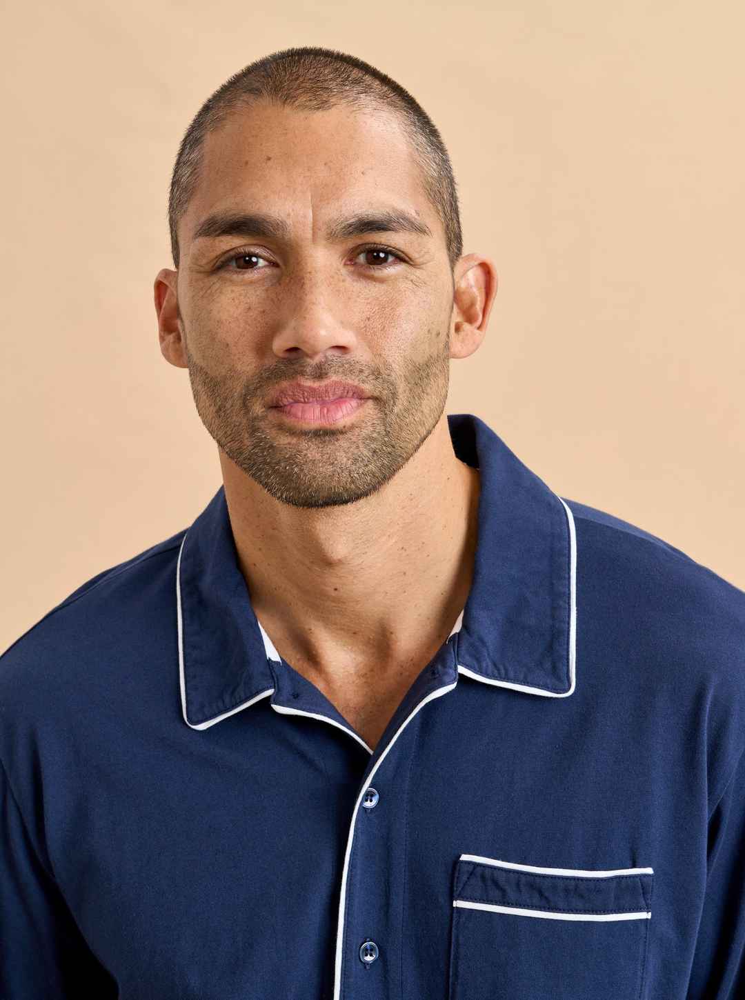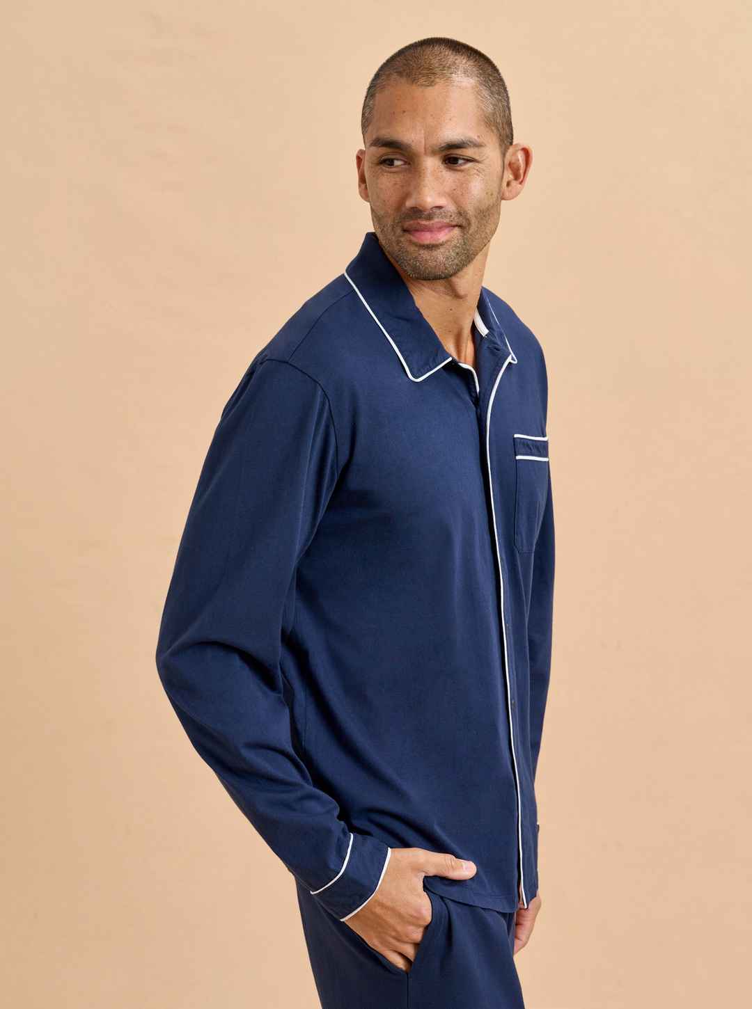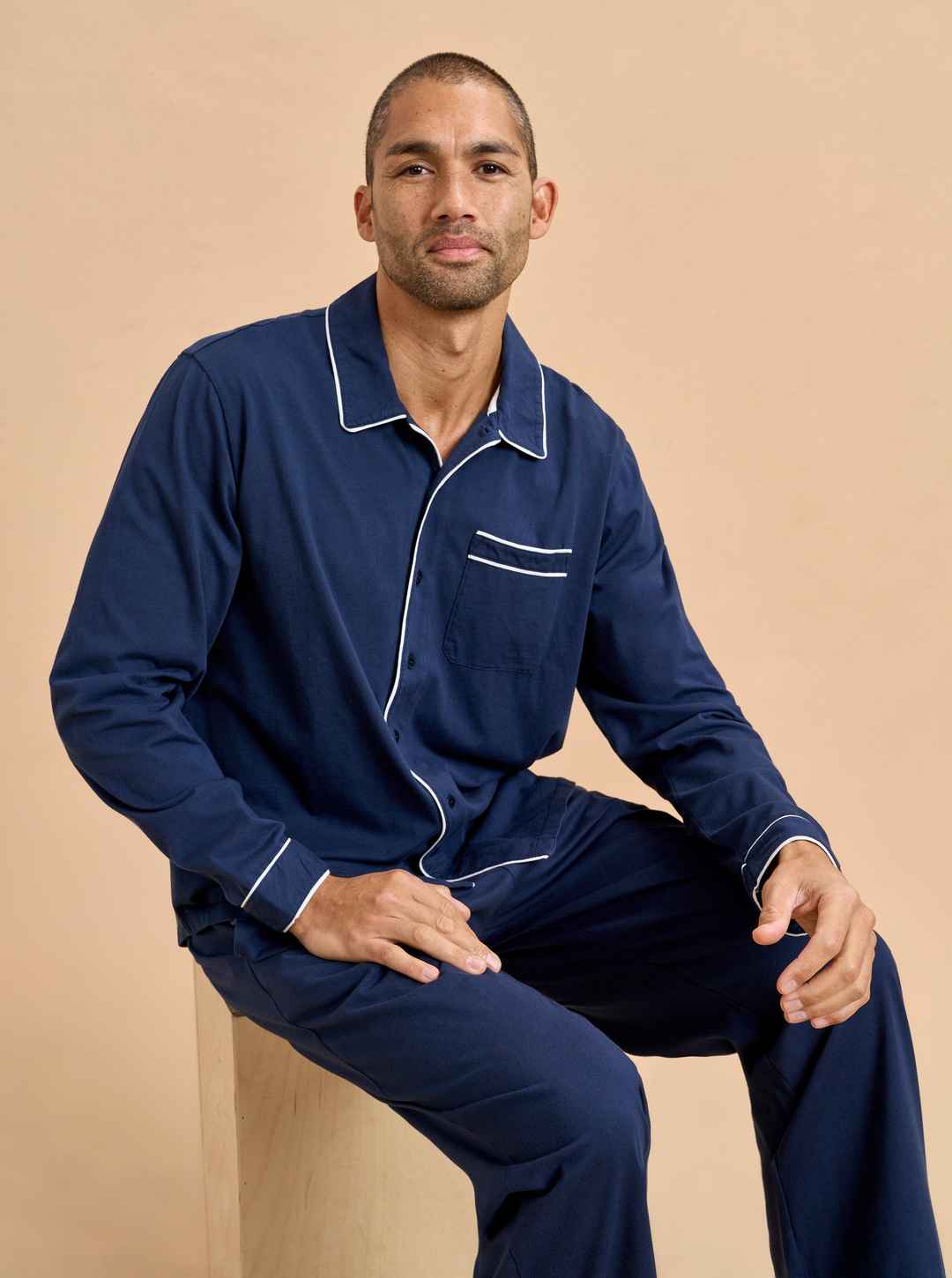 Now the favorite men in your life can join in the pajama party fun. Our men's version is cut from the same super soft t-shirt fabric for the ultimate in comfort. Navy blue cotton PJs framed with contrasting white piping, this set is comprised of a relaxed-fit top and elastic waistband pant.