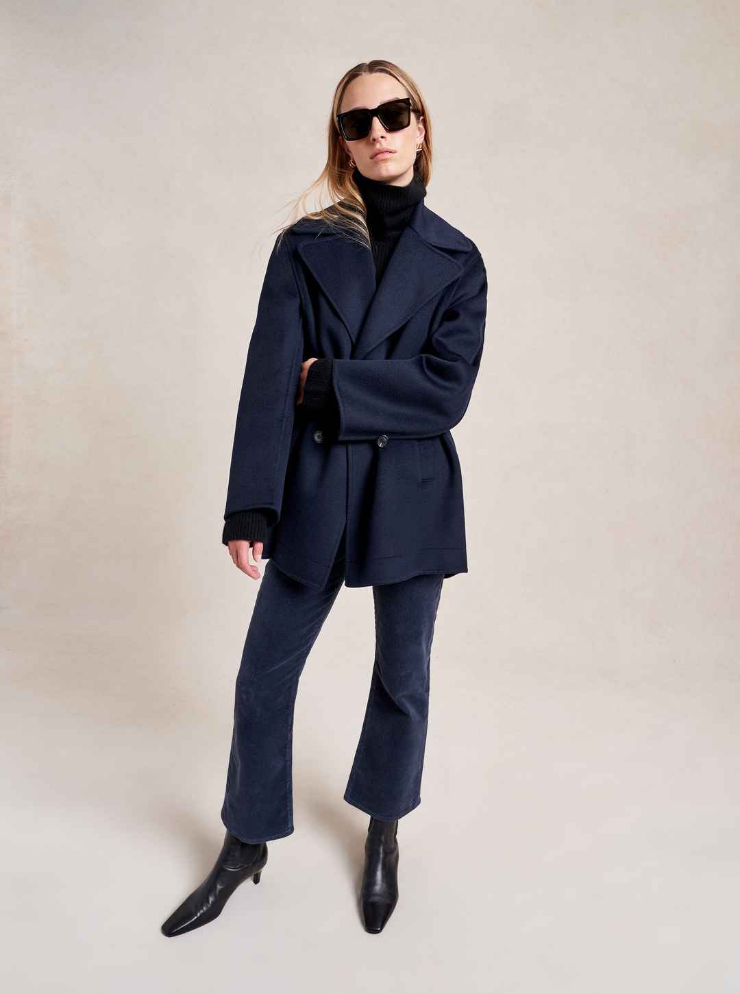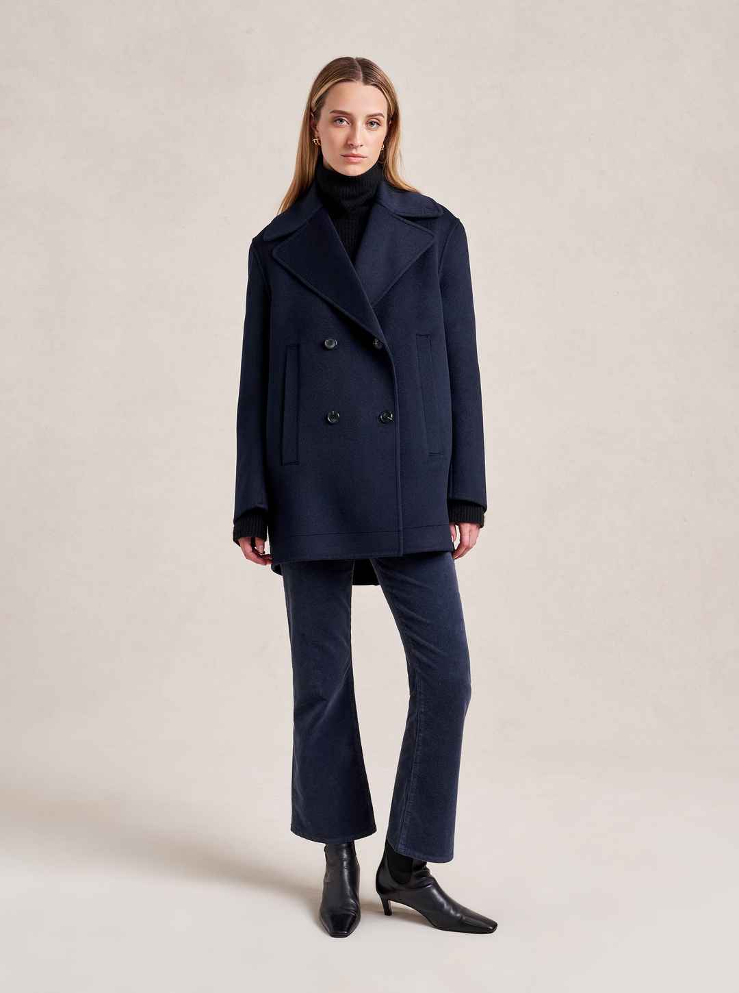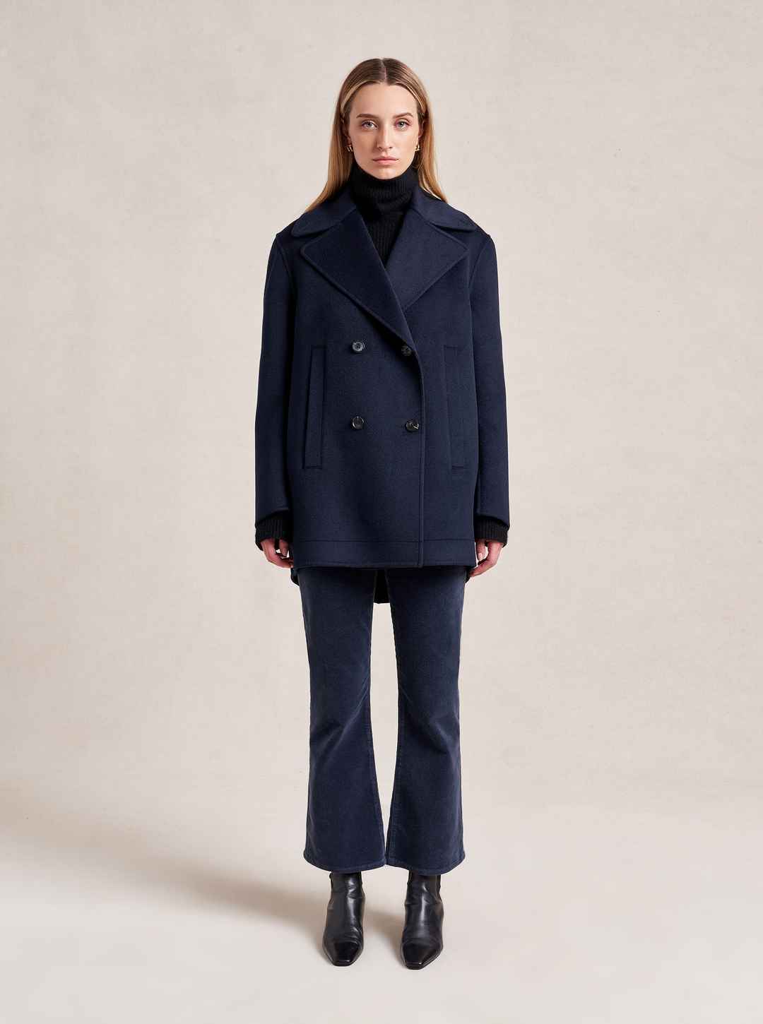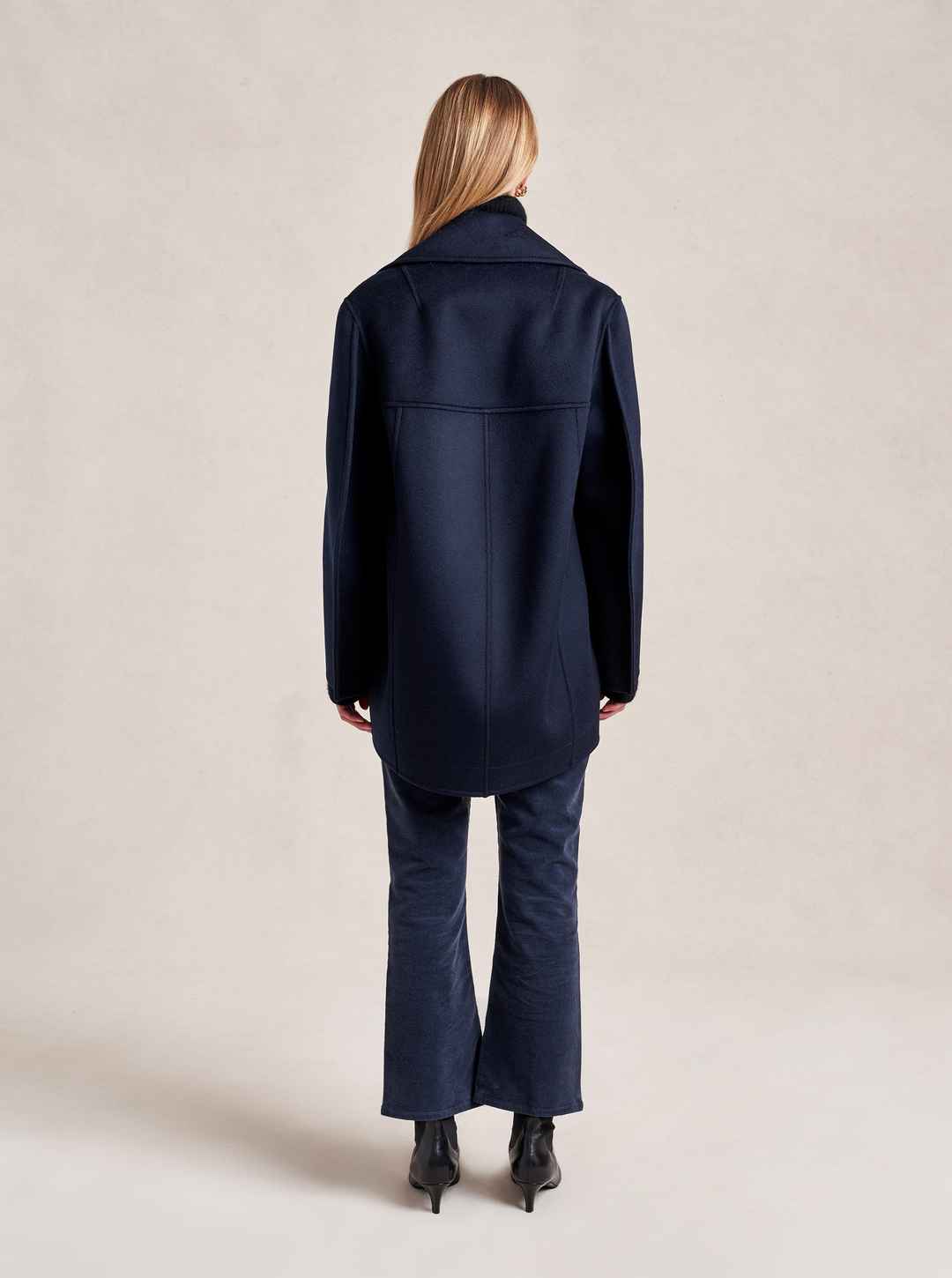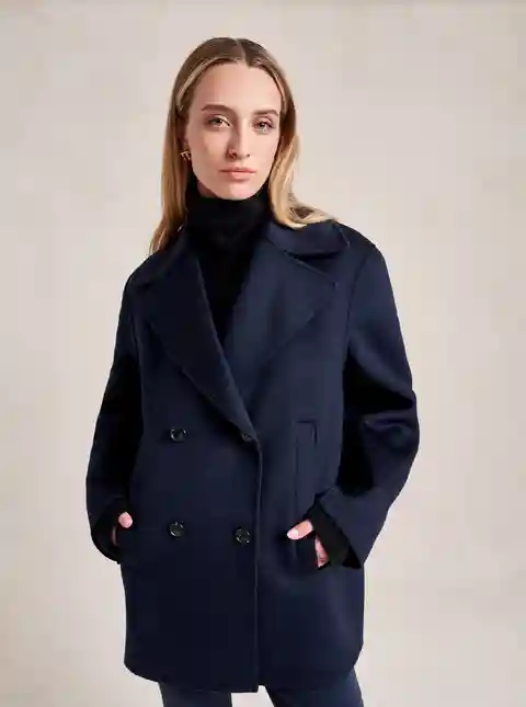 We may have perfected the perfect peacoat. Our double breasted version has all the classic details of the original fisherman's style but made up in a lightweight, extremely soft felted wool with a curved sleeve seam for a cocoon shape that drapes to perfection. Told you it was perfect...