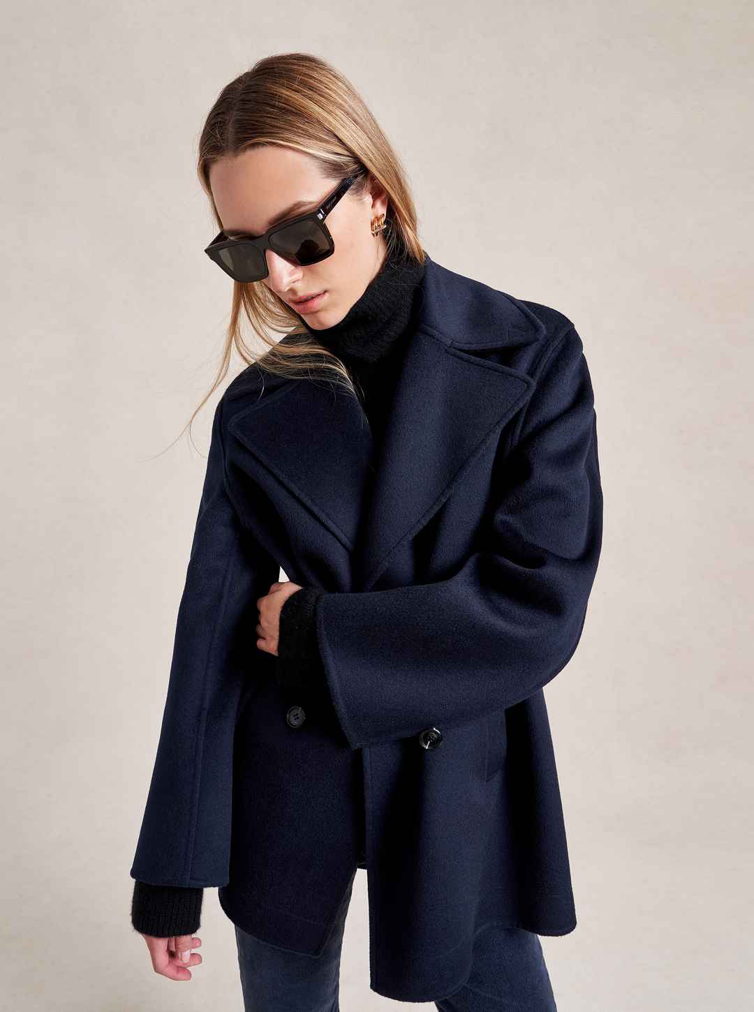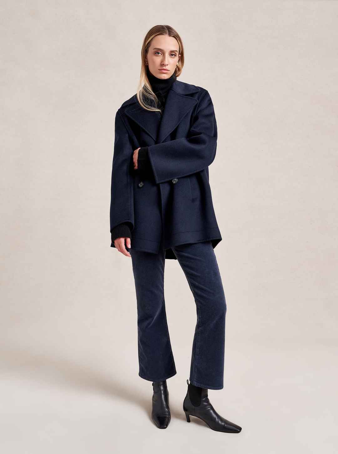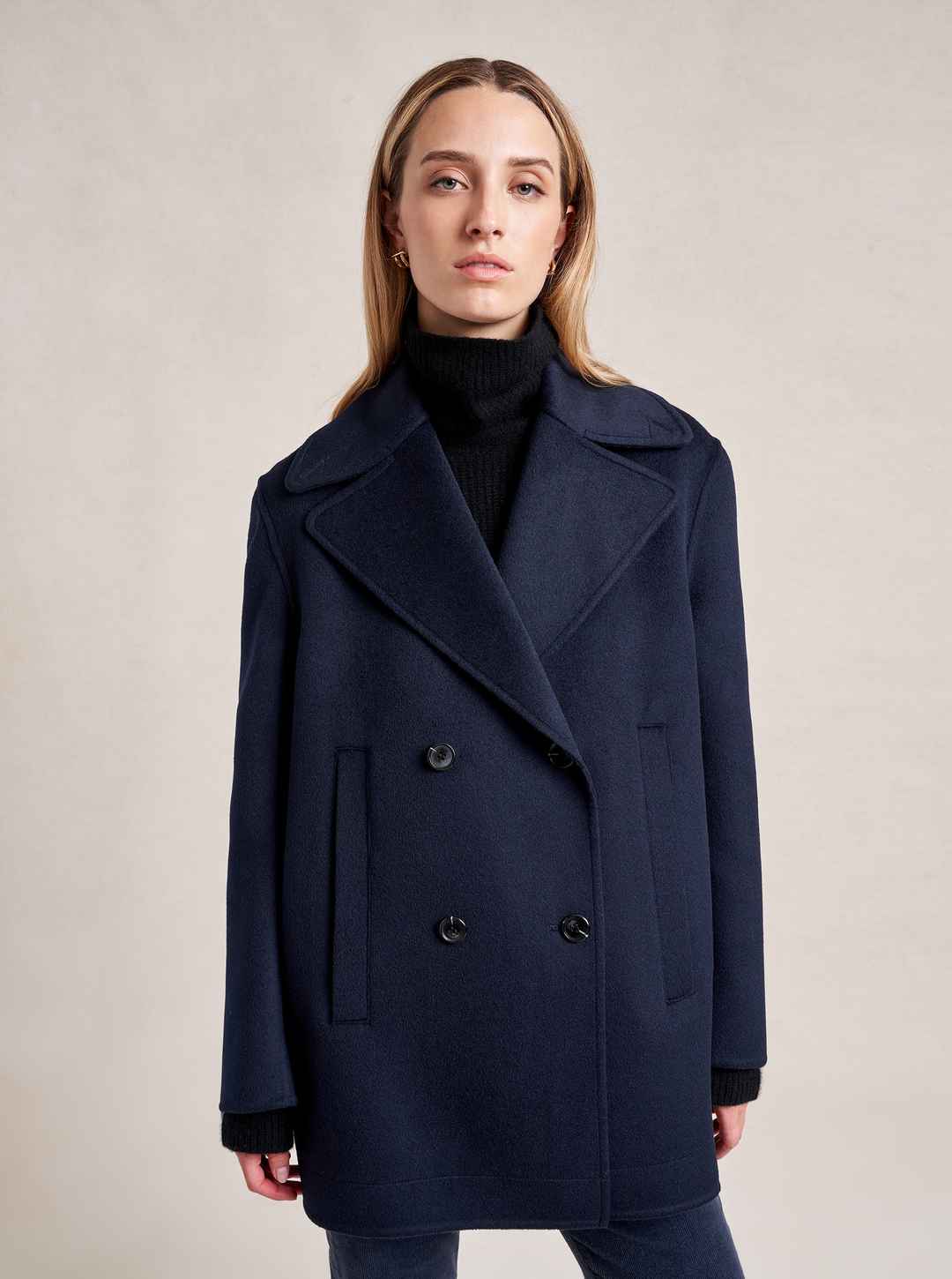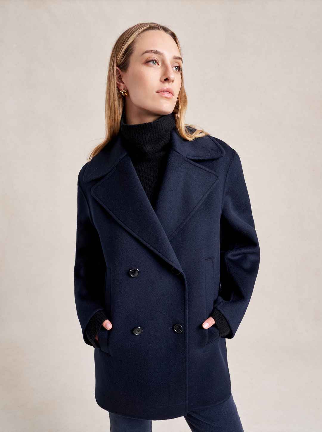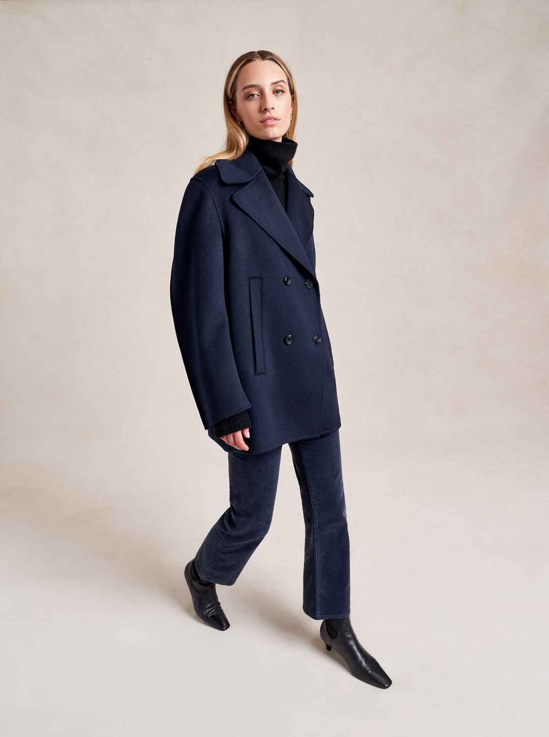We may have perfected the perfect peacoat. Our double breasted version has all the classic details of the original fisherman's style but made up in a lightweight, extremely soft felted wool with a curved sleeve seam for a cocoon shape that drapes to perfection. Told you it was perfect...
