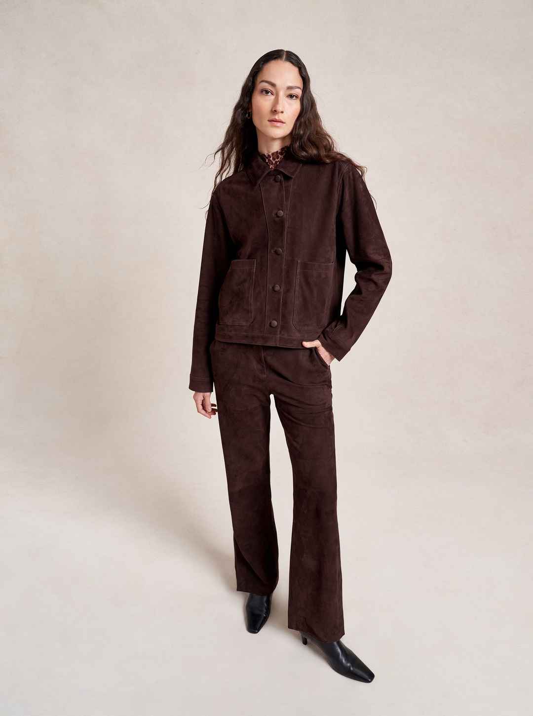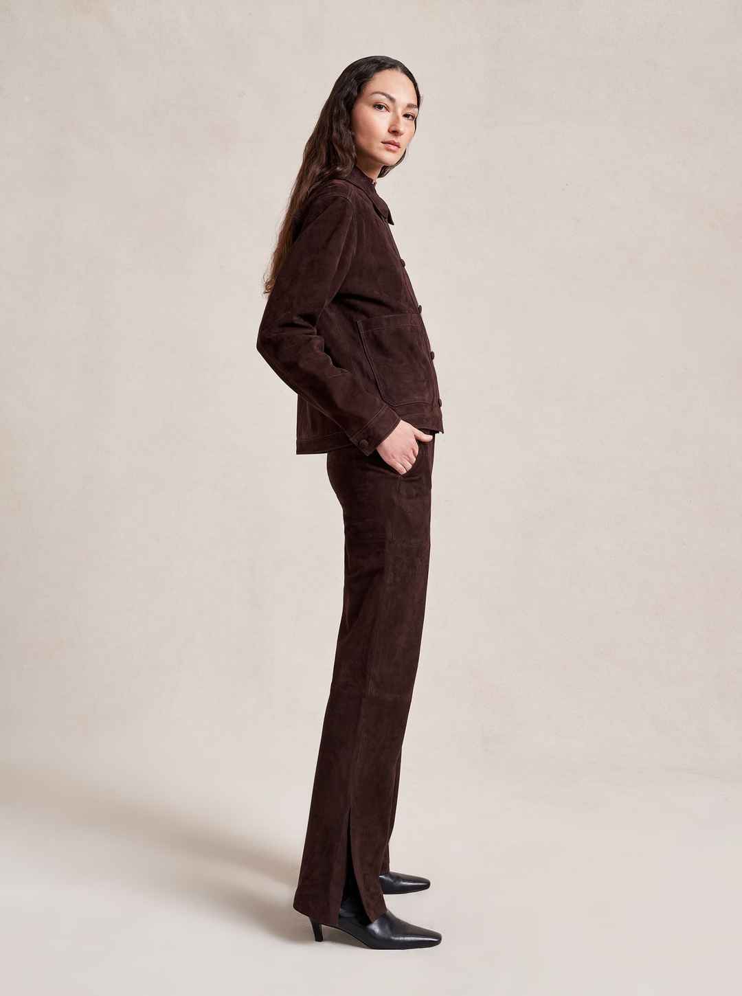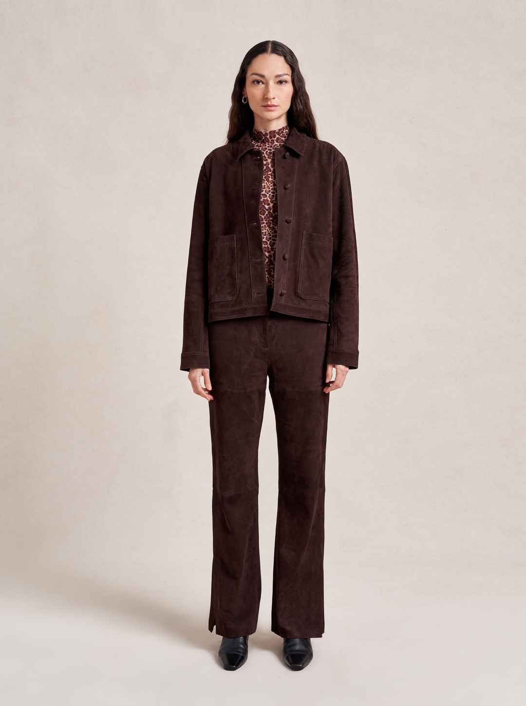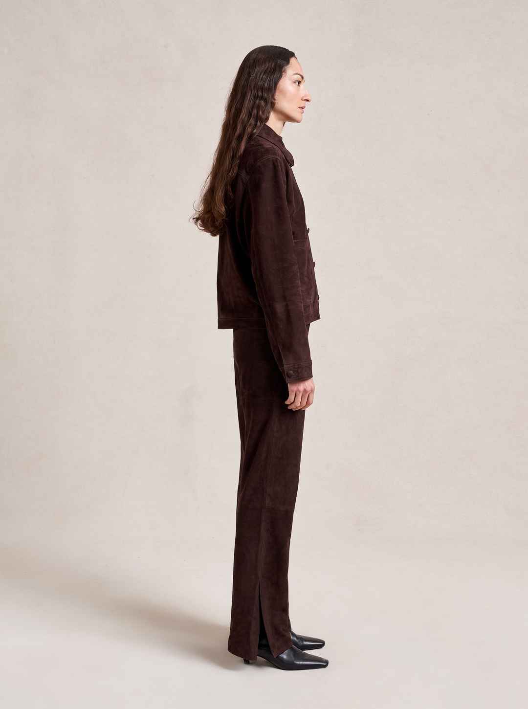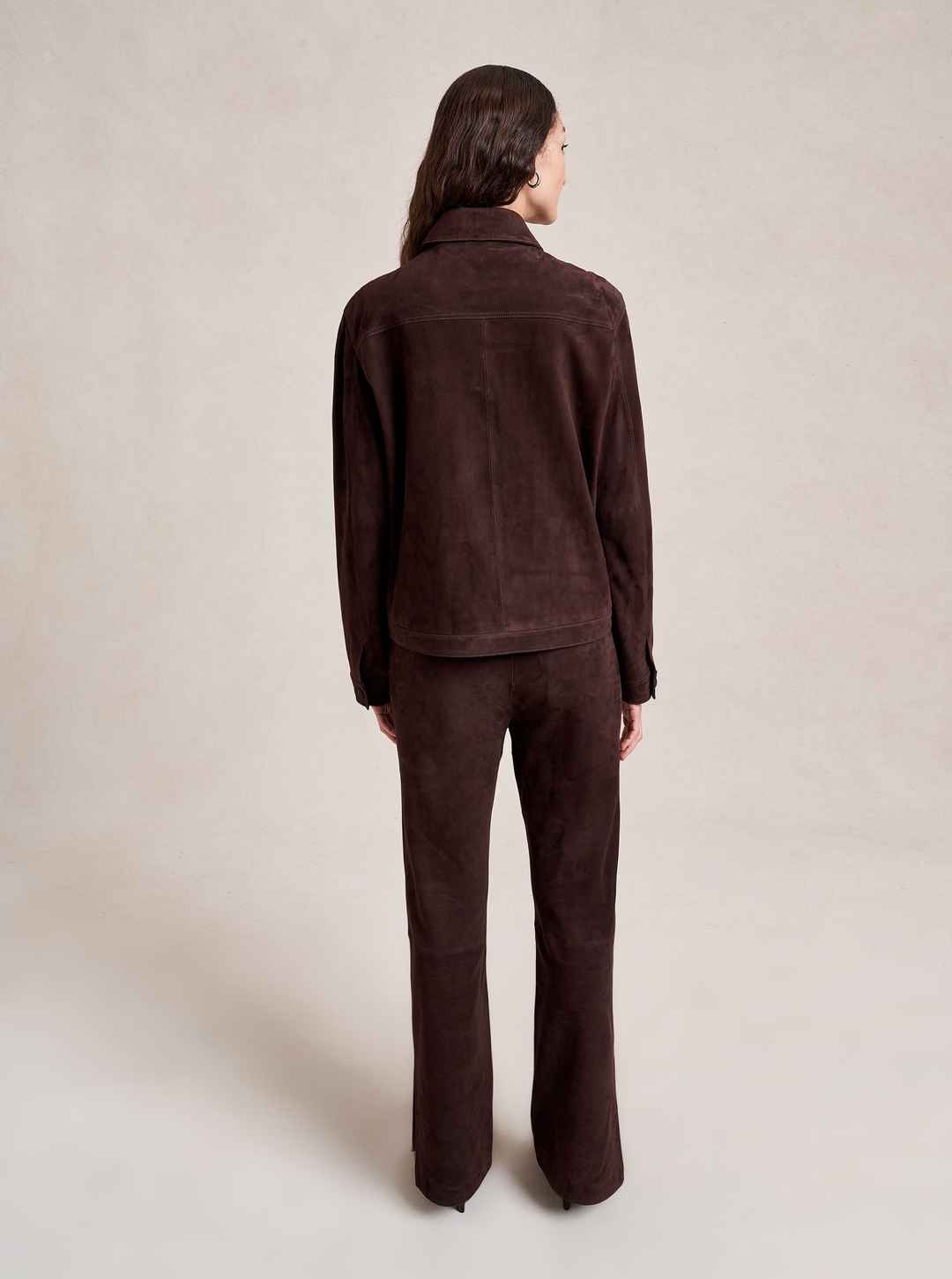 Based on our best-selling Val Jackets, this one in deliciously rich chocolate suede is cropped but roomy to go over a knit and an easy winner when paired back to our suede Albert Trouser.
