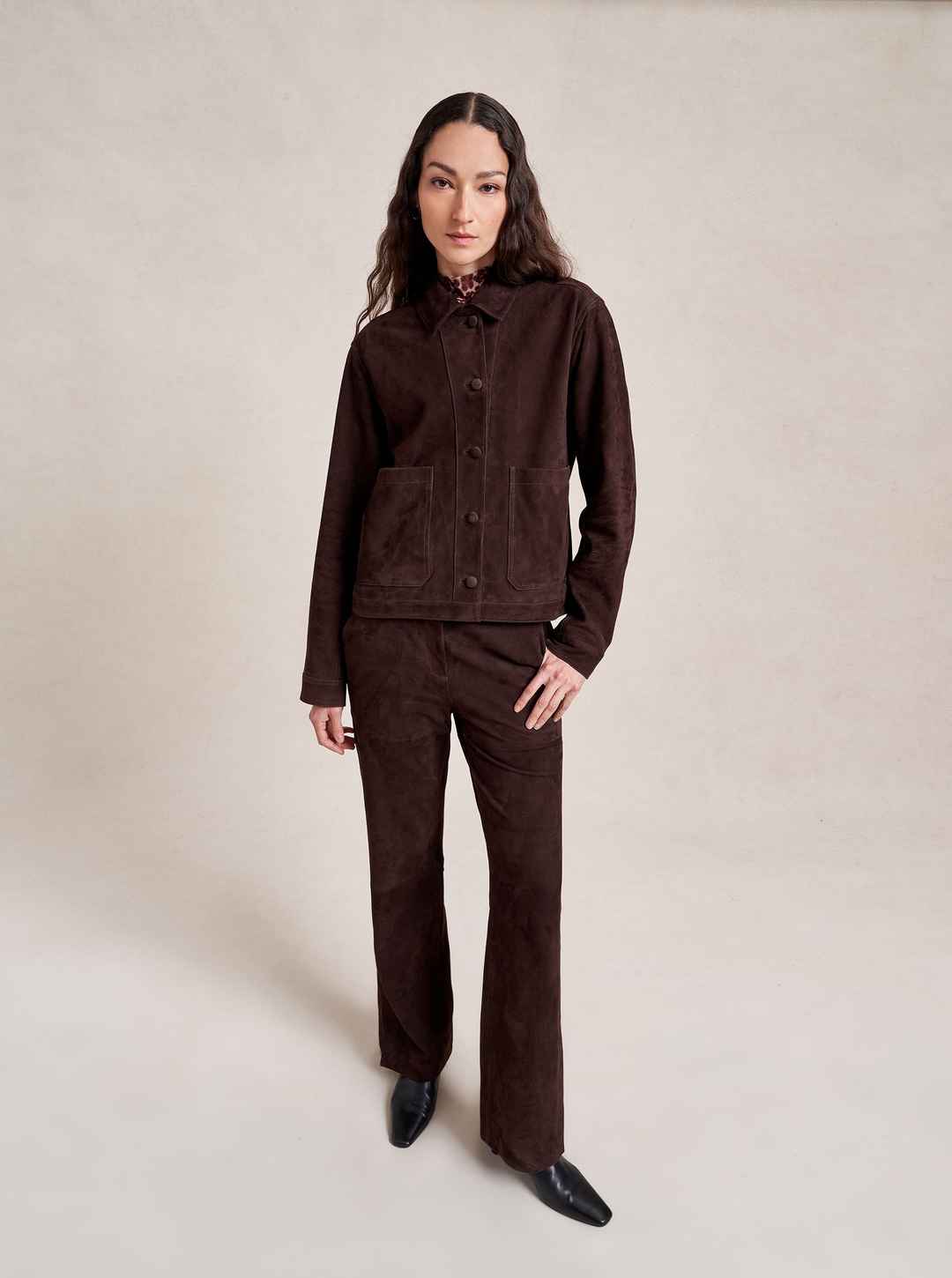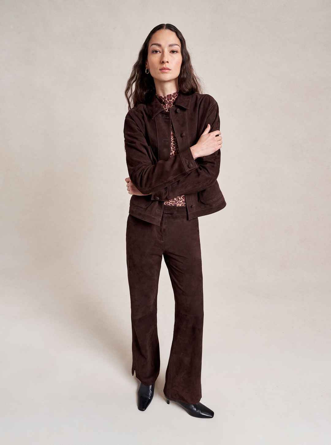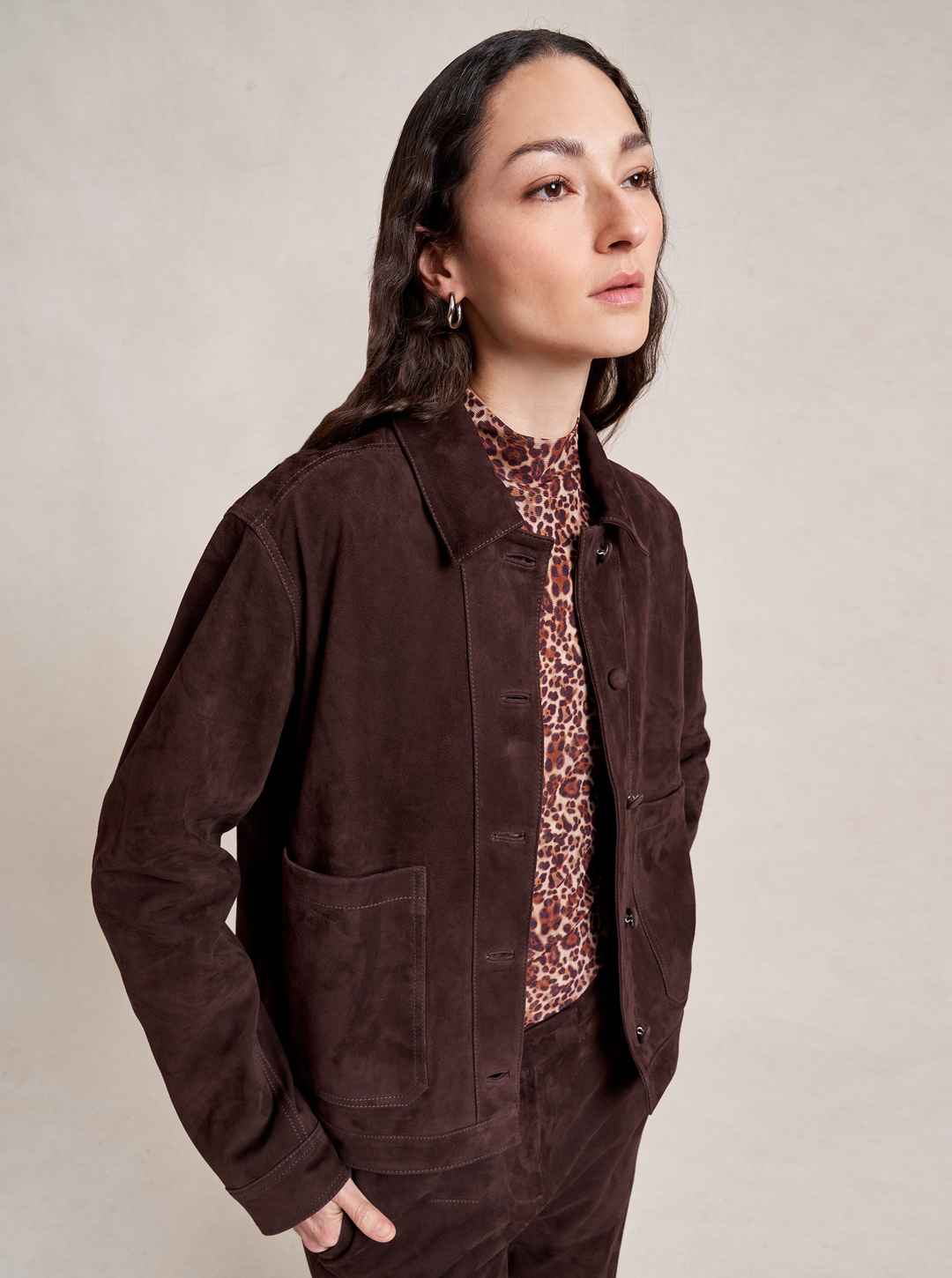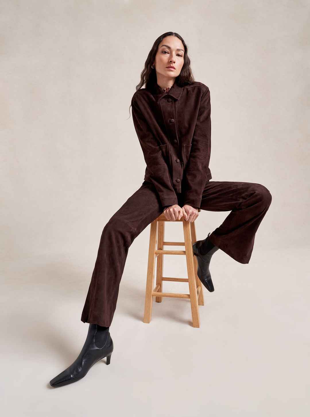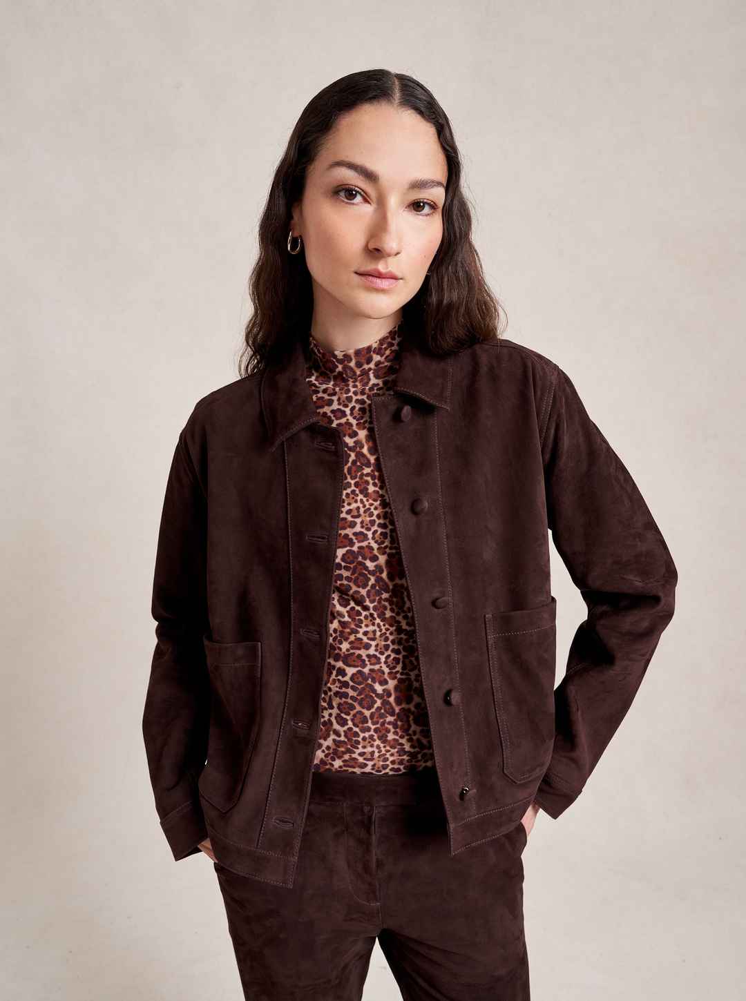 Based on our best-selling Val Jackets, this one in deliciously rich chocolate suede is cropped but roomy to go over a knit and an easy winner when paired back to our suede Albert Trouser.