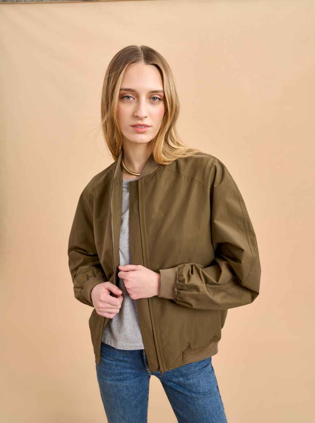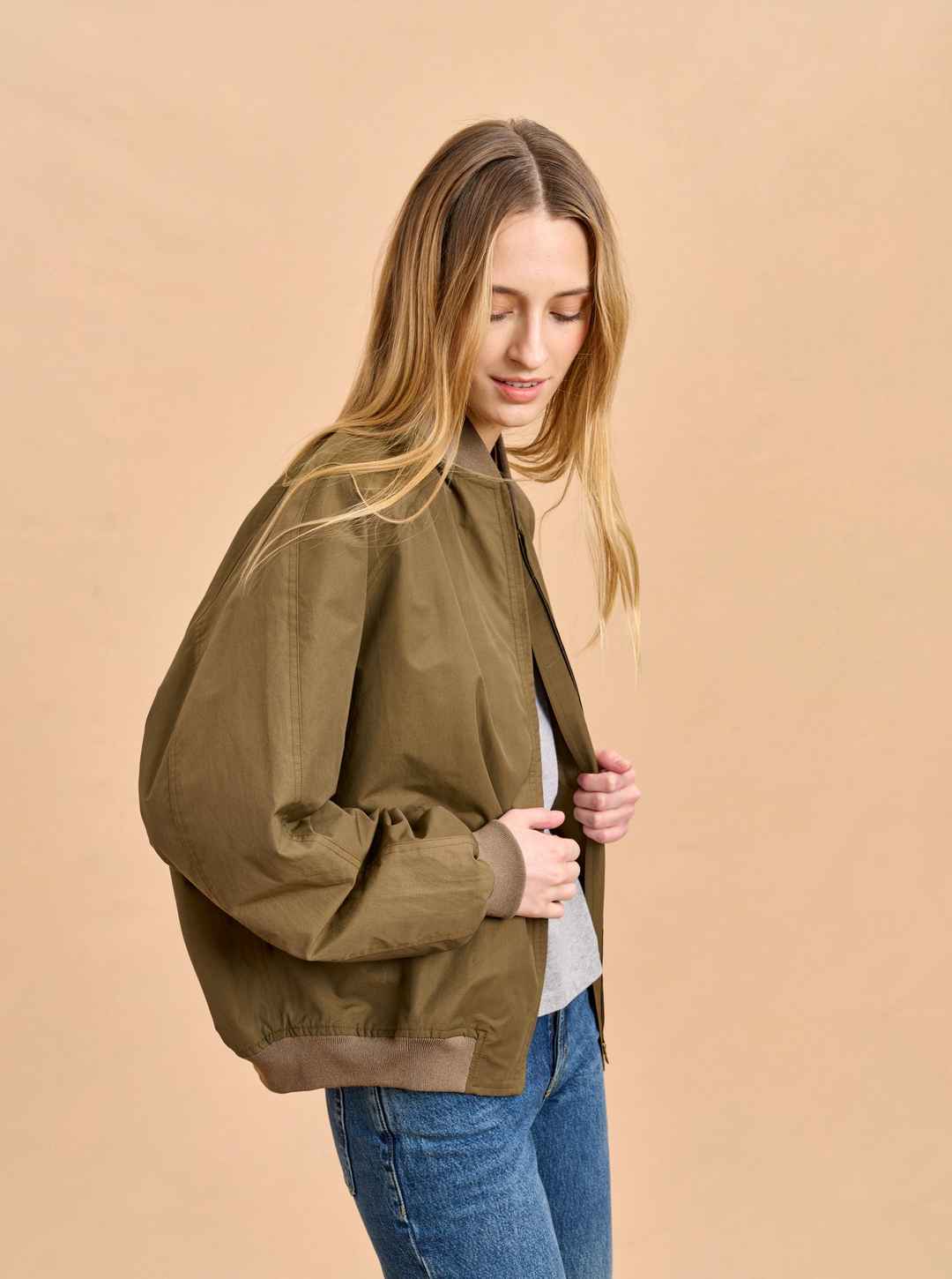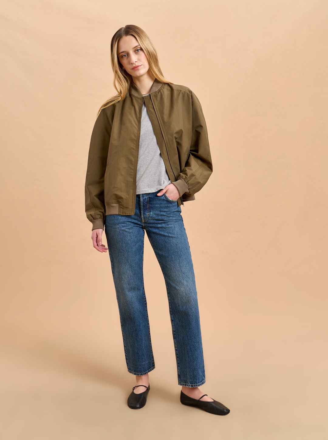 Borrowed from the boys can also include stealing from your dad with this vintage-style, oversize bomber in a lightweight cotton/nylon blend. Its bigger shape goes well with summer shorts or as a topper to wide leg pants with or without the aviators.