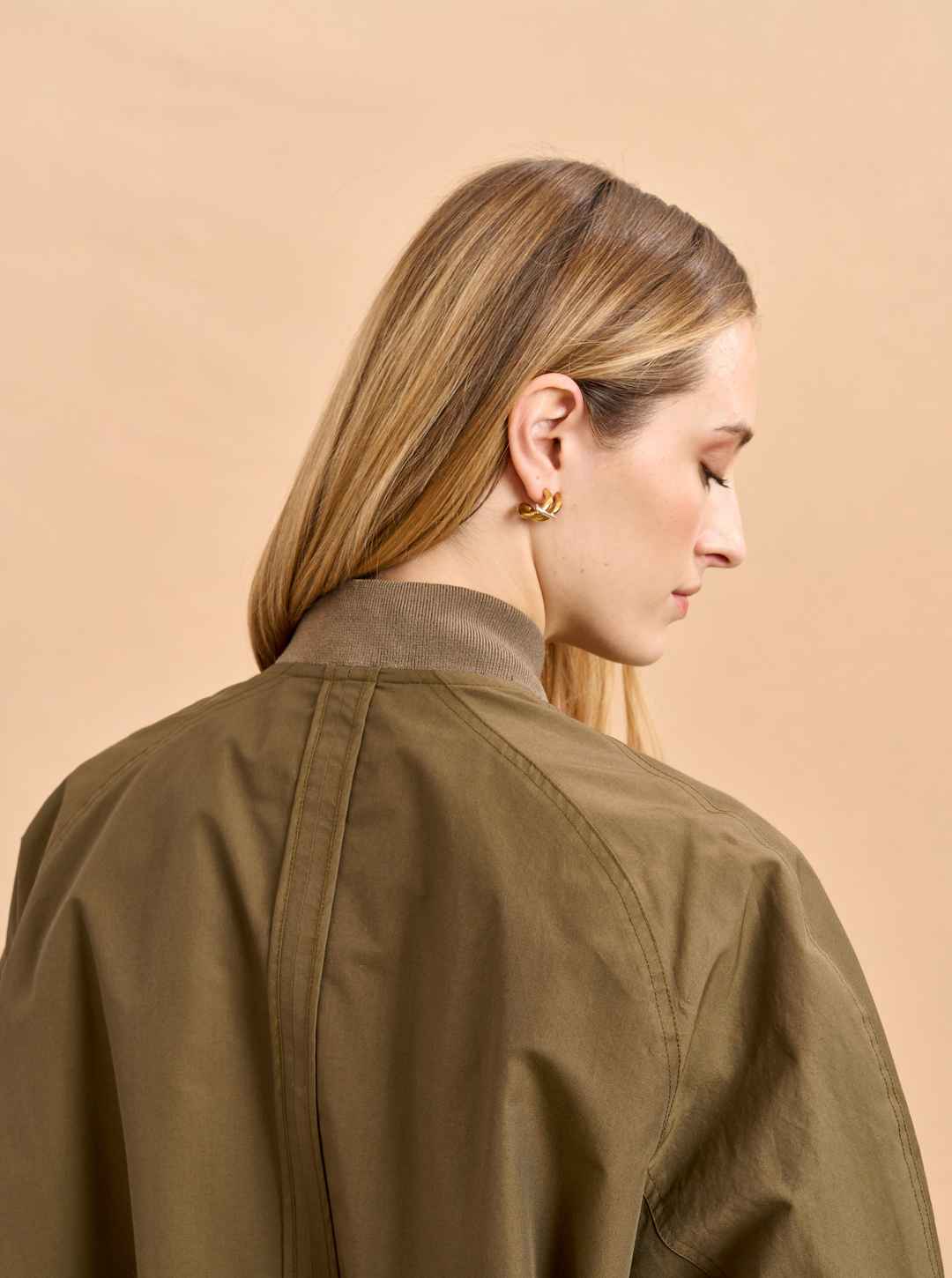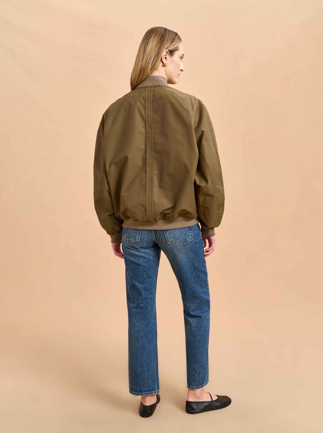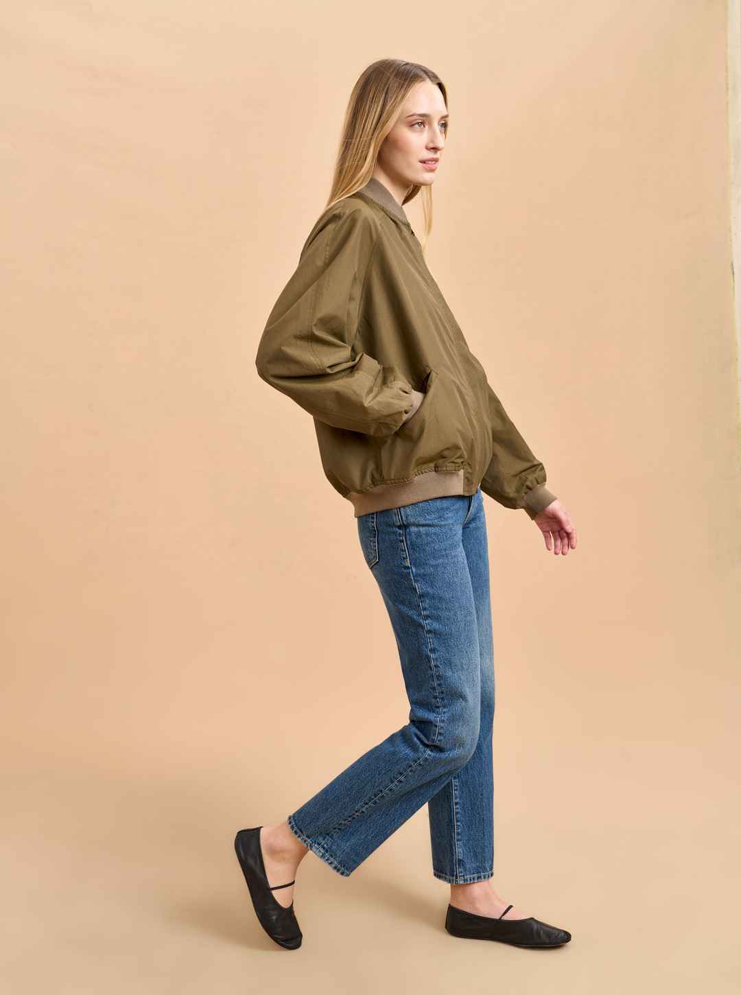 Borrowed from the boys can also include stealing from your dad with this vintage-style, oversize bomber in a lightweight cotton/nylon blend. Its bigger shape goes well with summer shorts or as a topper to wide leg pants with or without the aviators.