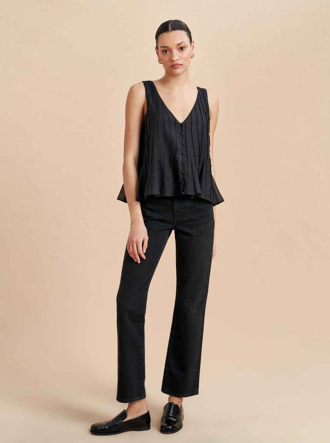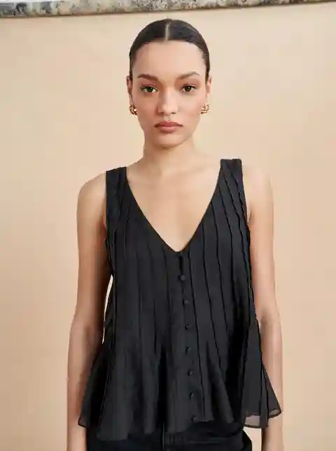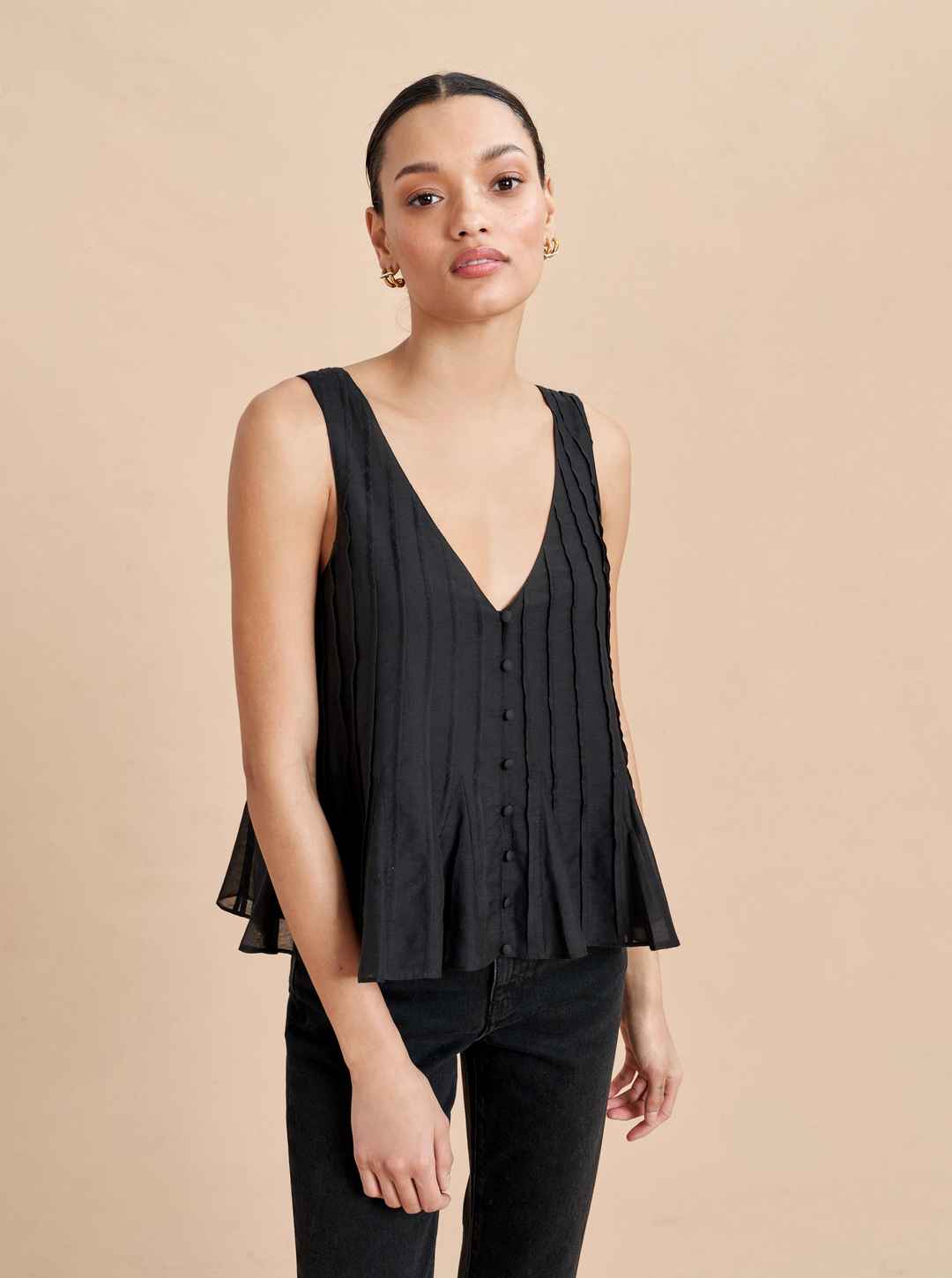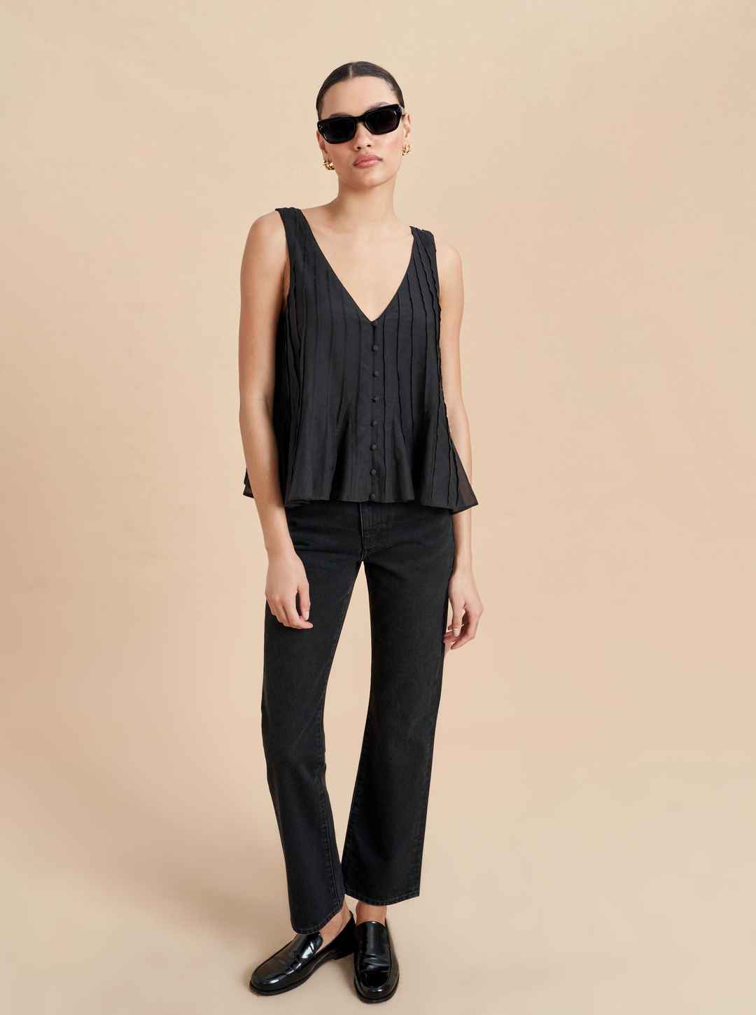 An update to a classic shell, this fluid top has pintuck details throughout and self-covered buttons down the front for a feminine take on a minimal style. Pair with a skinny pant to maximize its looser silhouette or play up the proportion with a wide leg jean. Add a cardigan and basket bag and chan...more