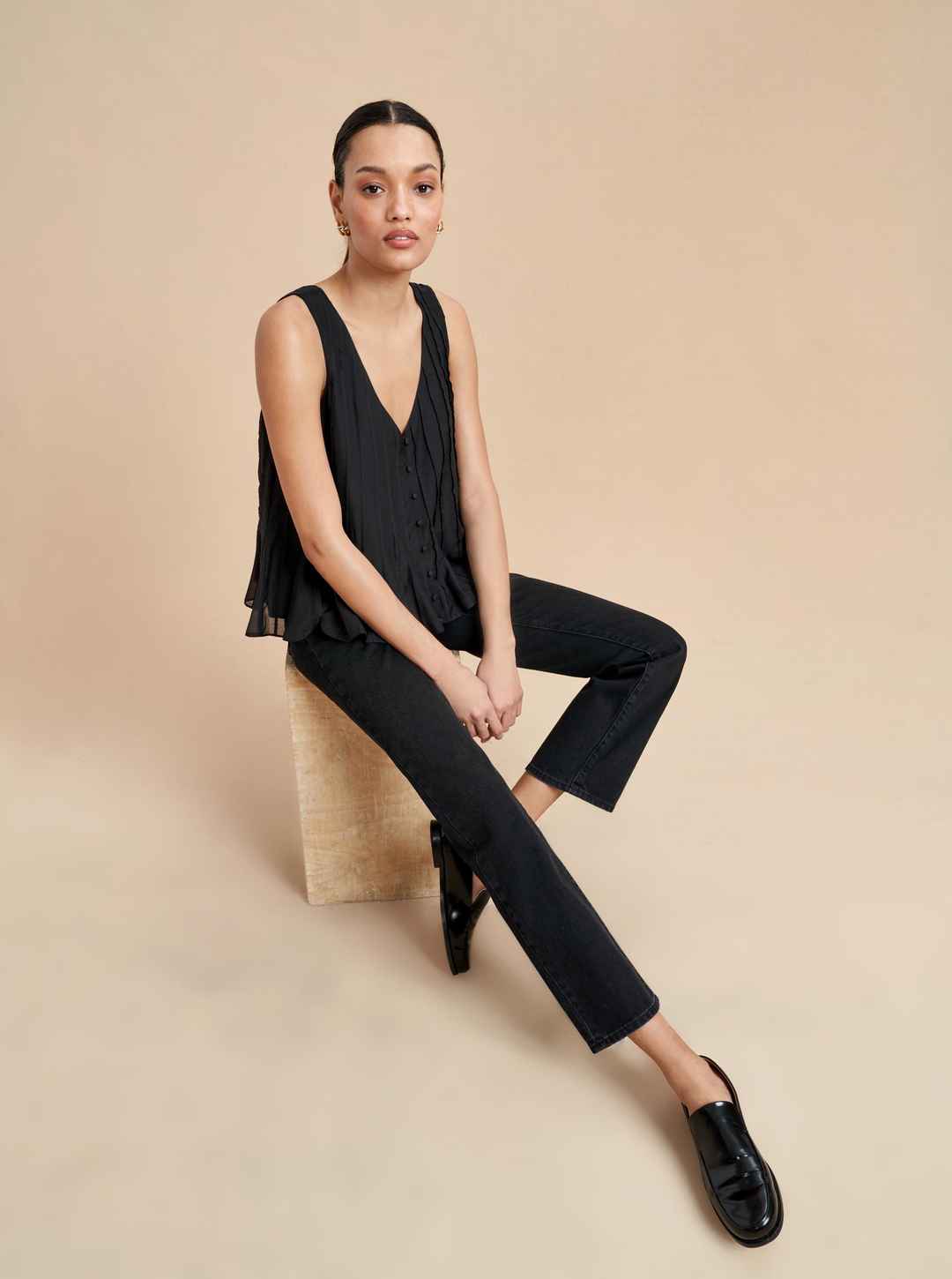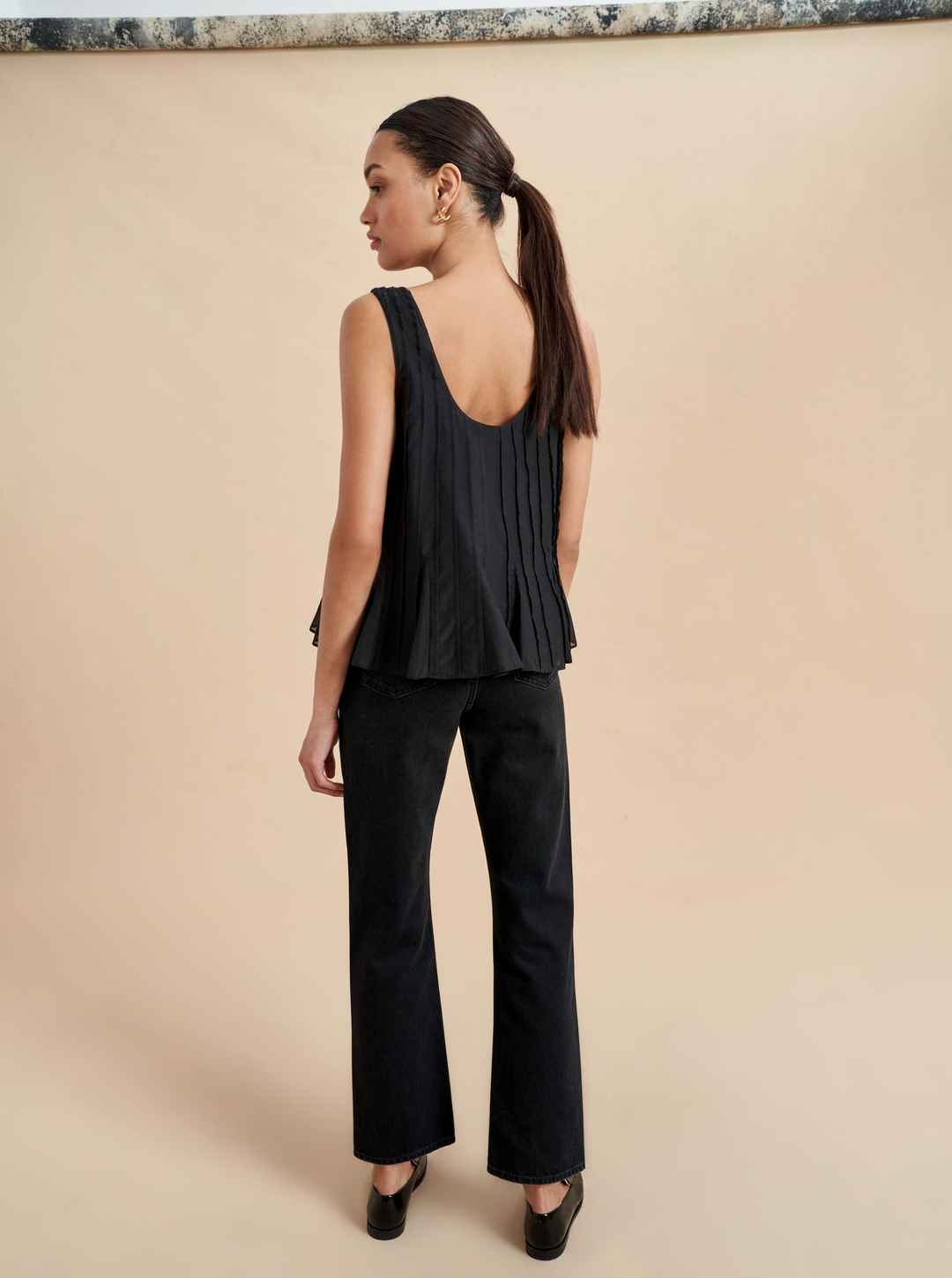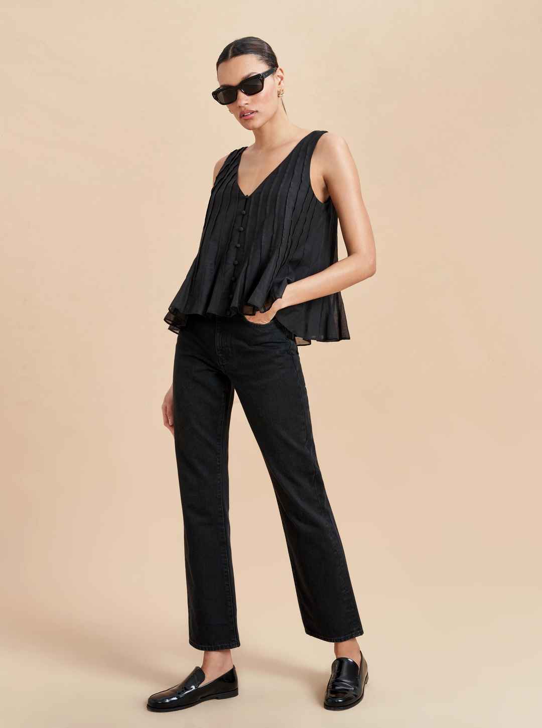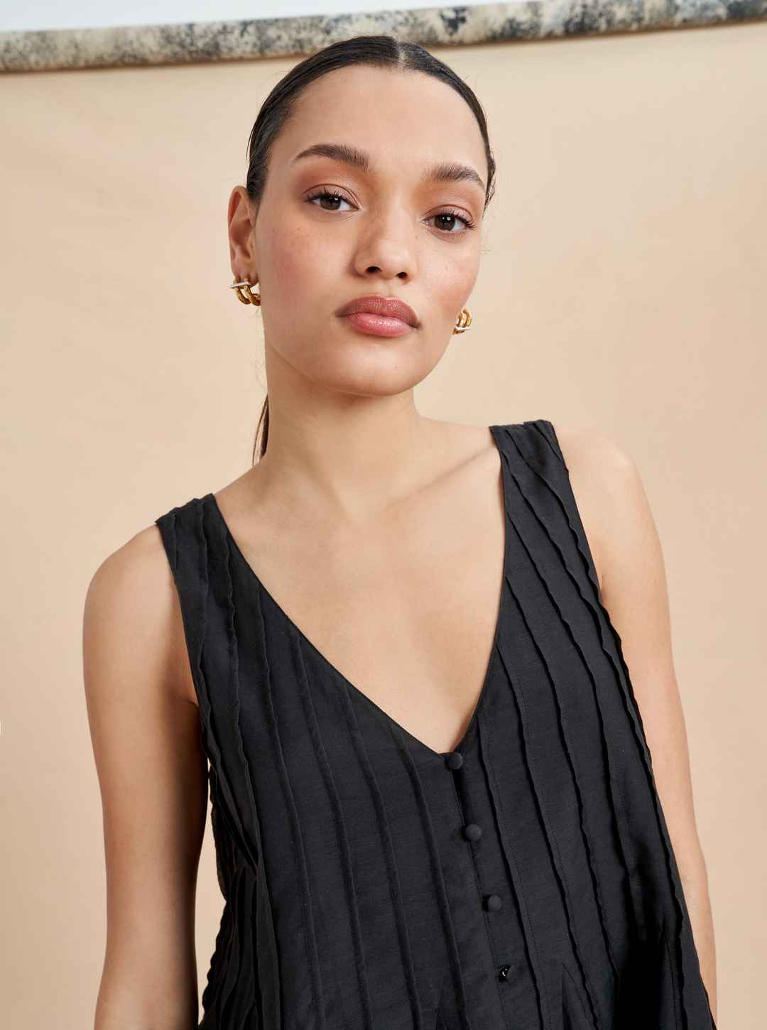An update to a classic shell, this fluid top has pintuck details throughout and self-covered buttons down the front for a feminine take on a minimal style. Pair with a skinny pant to maximize its looser silhouette or play up the proportion with a wide leg jean. Add a cardigan and basket bag and chan...more