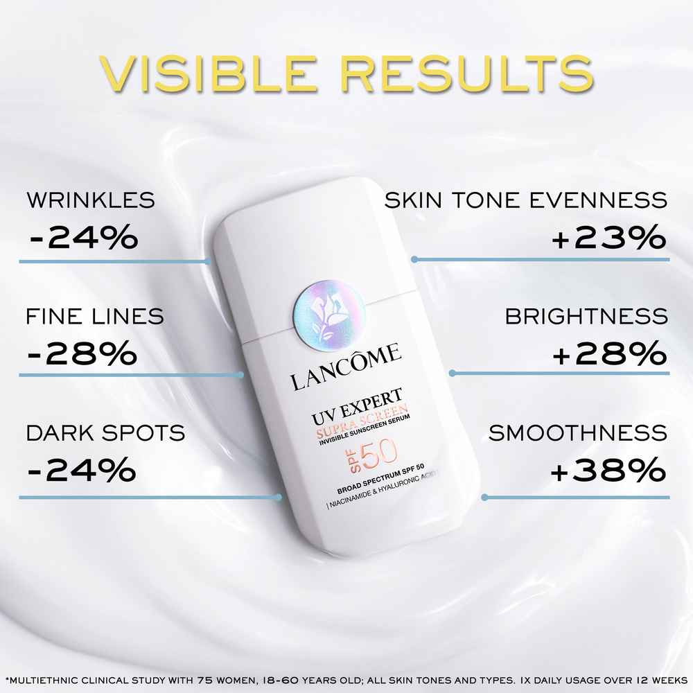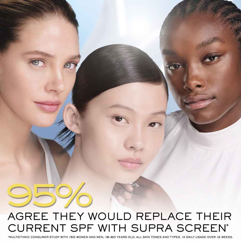OUR 1ST SPF 50+ WITH THE CLINICAL EFFICACY OF AN ANTI-AGING SERUM Up to 80% of aging signs are caused by sun damage, leading to dark spots, dullness, and fine lines. Introducing: Supra Screen SPF 50+ broad-spectrum sunscreen, a patented UV technology, combined with 3 powerful ingredients to help cor...more