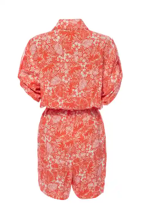 Everything about this romper from the button front and the waist tie, to the rolled-up sleeves and front tie and our bespoke palm and hibiscus collage print ensures its status as your go-to summer favorite! Fabrication: 100% VISCOSE