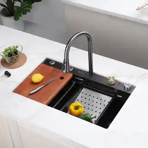 The Lefton waterfall workstation kitchen sink creates a versatile workspace so you can conveniently wash fruits and vegetables with its unique waterfall and proper drainage basket. The single large bowl provides ample space for soaking and cleaning cookware, while the sloped base to the single offse...more