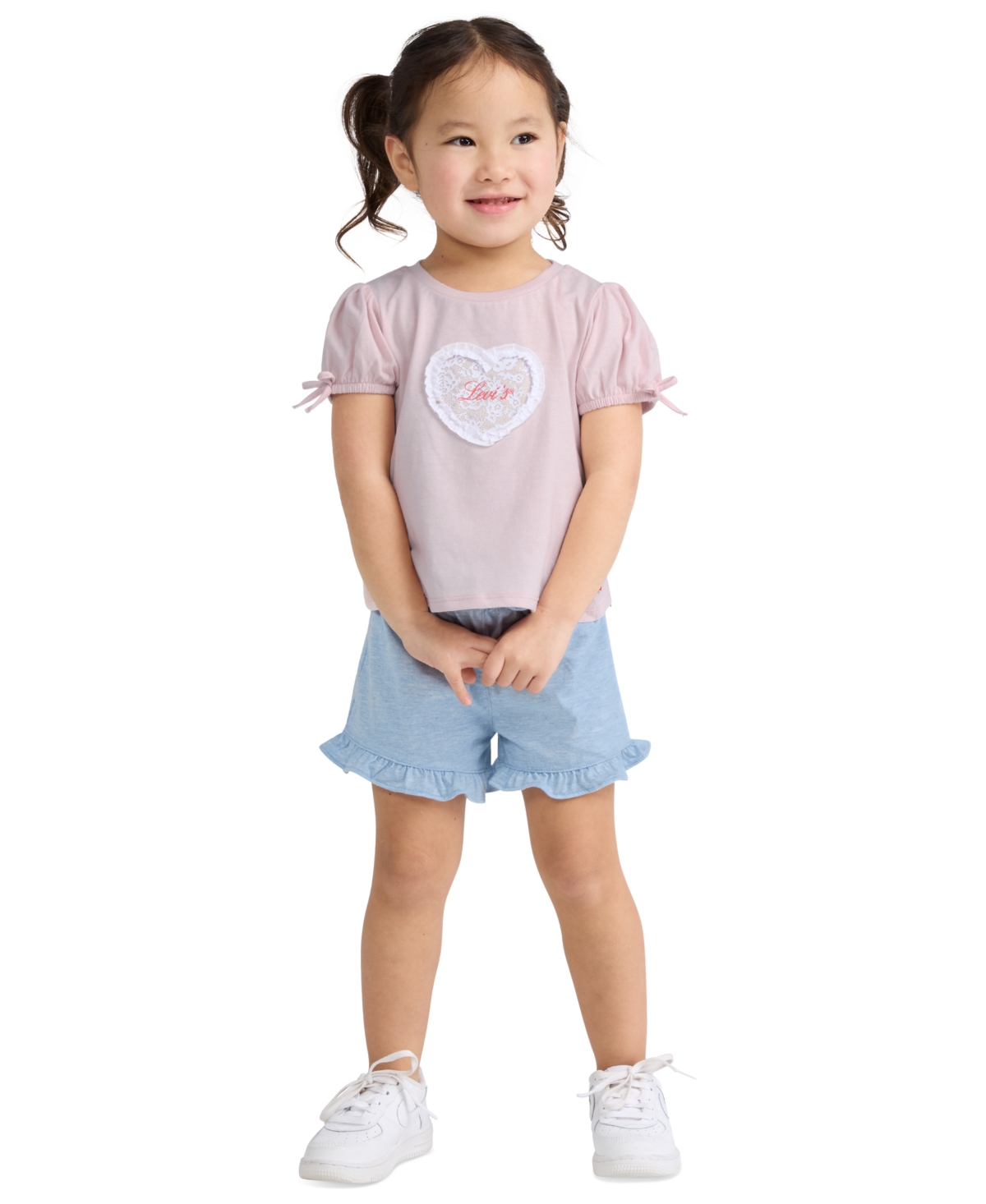 Keep her summer style sweet and comfortable with this Levi's set, featuring a bow-sleeve T-shirt with a round neck and playful heart graphic. Coordinating belted shorts in knit jersey offer an elastic waistband, ruffle hem, and bow-accented belt for a cute, polished look.