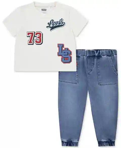 Prepare for the next adventure with this Levi's set, featuring a graphic jersey T-shirt and denim joggers. This set combines cuteness with comfort for the perfect fun little outfit.