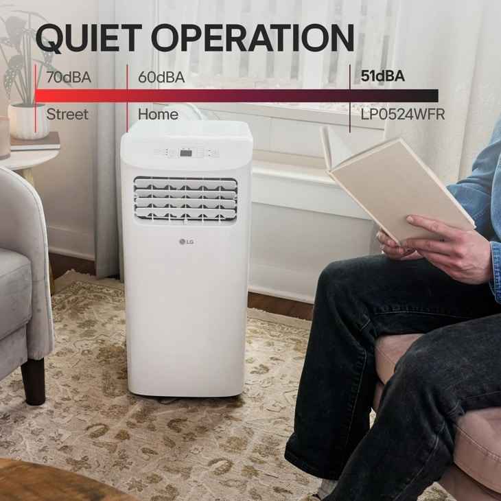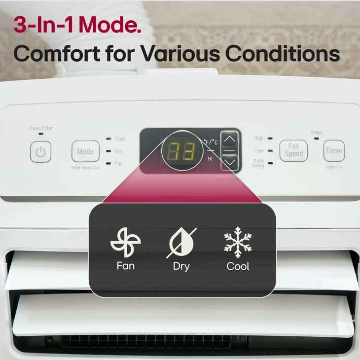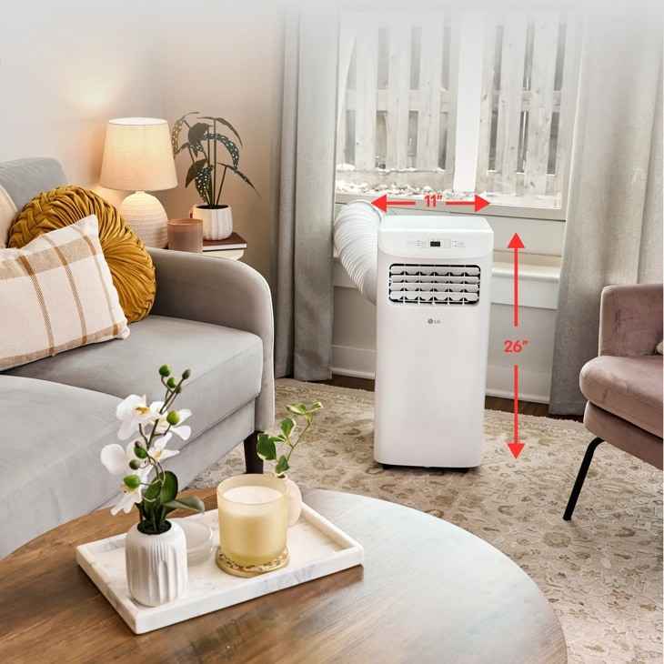 Cool down your desired space with this 6, 000 BTU (SACC) / 8, 765 BTU (ASHRAE) Air Conditioner, Stay comfortable with this LG Air Conditioner that cools up to 250 square feet, Bring your LG Portable Air Conditioner anywhere you need it with the easy to roll caster wheels, Make temperature adjustment...more
