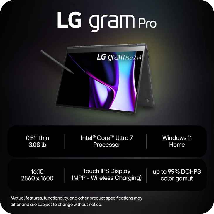 LG gram Pro 16" 2in1 Thin and Lightweight Laptop, Intel Evo Edition - AI-enabled Intel Core Ultra 5 processor, Windows 11 Home, 16GB RAM, 512GB SSD