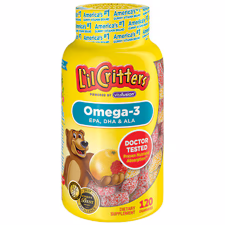 Omega-3 fatty acids can play an important role in your child's overall health, but most children do not eat enough of the right foods to get this important nutrient from their diet alone.[2] L'il Critters Omega-3 Gummy Fish offers a healthy, convenient and delicious way for kids to supplement their ...more