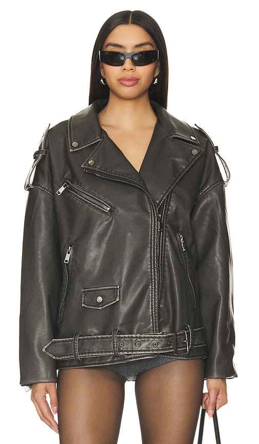 LIONESS Ace Biker Jacket in Charcoal. - size XXS (also in L, M, S, XS, XXL) LIONESS Ace Biker Jacket in Charcoal. - size XXS (also in L, M, S, XS, XXL) 100% polyurethane. Made in China. Dry clean only. Front asymmetrical zipper closure. 4-pocket design. Attached belt at hem. Midweight faux leather f...more