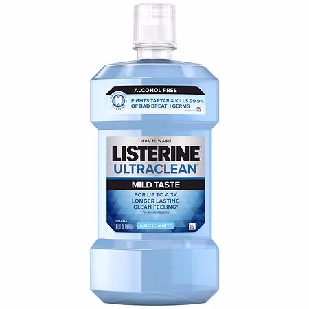 Listerine Ultraclean Alcohol-Free Mouthwash in a mild Arctic Mint flavor fights tartar** and kills 99.9% of bad breath germs. This alcohol-free mouthwash gets into hard-to-reach areas that brushing might miss to kill 99.9% of germs that cause bad breath, and tartar stains. When used twice daily, the...more