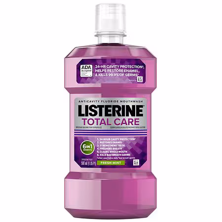Listerine Total Care Fluoride Anticavity Mouthwash for 6 benefits in 1 oral rinse Formula helps prevent cavities, restore enamel, and strengthen your teeth to improve oral health Oral rinse with 5x more cleaning power* freshens breath & kills germs that cause bad breath Remineralizing mouthwash stre...more