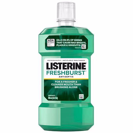 Listerine Fresh burst Antiseptic Mouthwash for bad breath & 24-hr protection from germs. Clinically shown to prevent & reduce more plaque and gingivitis than brushing and flossing alone. Germ-killing oral rinse from the dentist recommended brand of over the counter mouthwashes. Rinse with mouthwash ...more
