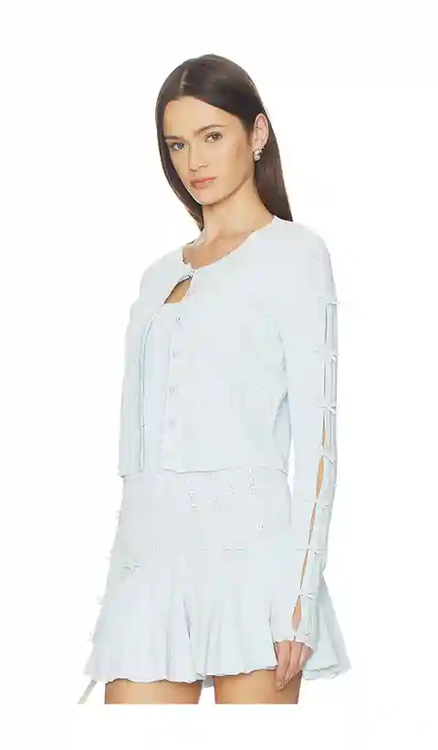 LoveShackFancy Zoriah Cardigan in Baby Blue. - size L (also in M, S, XS, XXS) LoveShackFancy Zoriah Cardigan in Baby Blue. - size L (also in M, S, XS, XXS) 83% Viscose, 17% Polyester. Dry clean or hand wash. Hidden front snap button closure. Pinhole detail throughout. Cut-outs with faux bow closure ...more