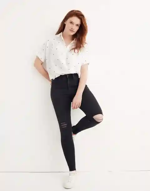 Lean and legs-for-days sexy, these 9" mid-rise skinny jeans come in our favorite distressed black denim. Sit above hip, fitted through hip and thigh, with a skinny leg.Front rise: 9"; inseam: 30 1/2"; leg opening for size 25: 9 3/4".Premium 93% cotton/5% poly/2% elastane ISKO Ref...more