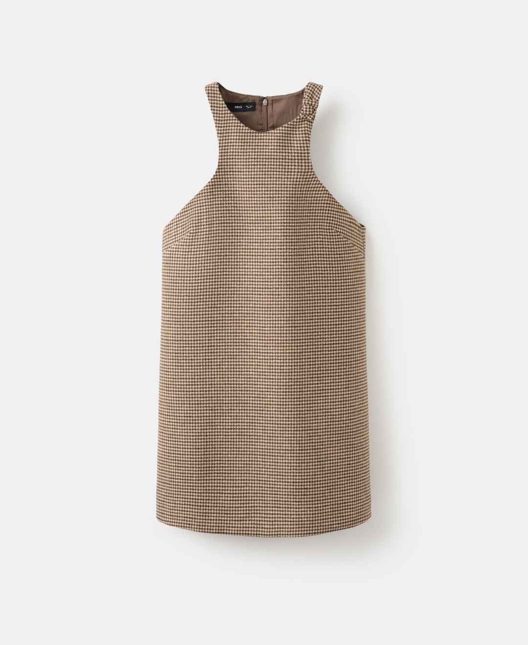 Lean into classic patterning with the Houndstooth Wool-Blend Dress from Mango. Made from wool mix fabric, this dress features a short cut, round neck, sleeveless cut, back zip, strap button detail, and inner lining.