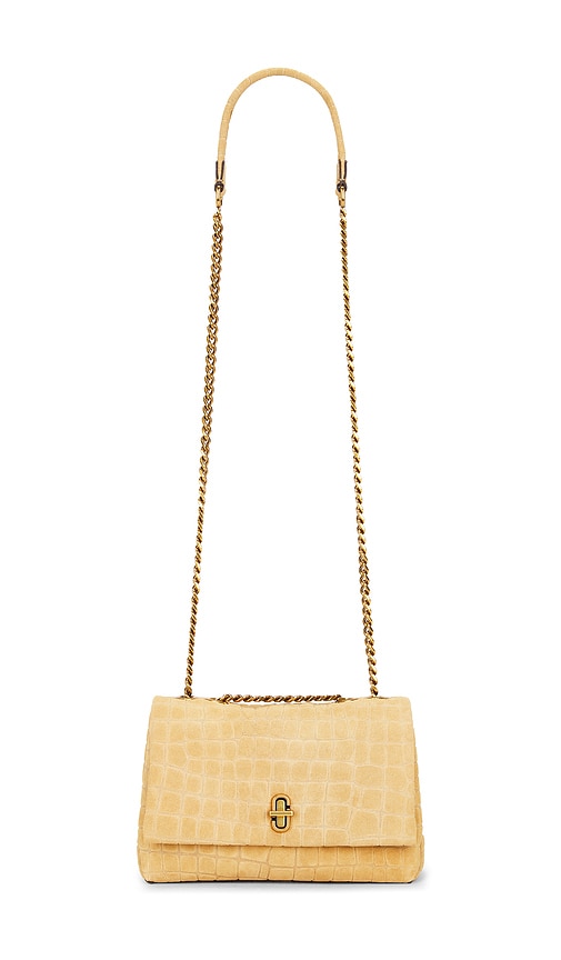 Marc Jacobs The Slim Dual Chain Shoulder in Mustard. Marc Jacobs The Slim Dual Chain Shoulder in Mustard. Embossed suede exterior with textile lining and gold-tone trim. Top flap with front toggle closure. One main compartment. One interior zip pocket. Adjustable strap. Dust bag included. Measures a...more