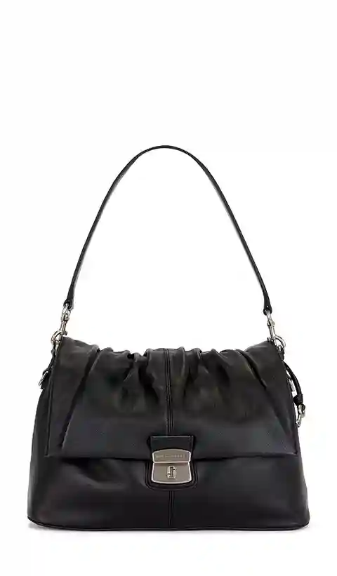 Marc Jacobs The Messenger Shoulder Bag in Black. Marc Jacobs The Messenger Shoulder Bag in Black. Leather exterior with canvas lining. Top flap with magnetic closure. Two main compartments. Large middle pocket with zip closure. Two removable straps included. Ruching detail at top flap. Dust bag incl...more