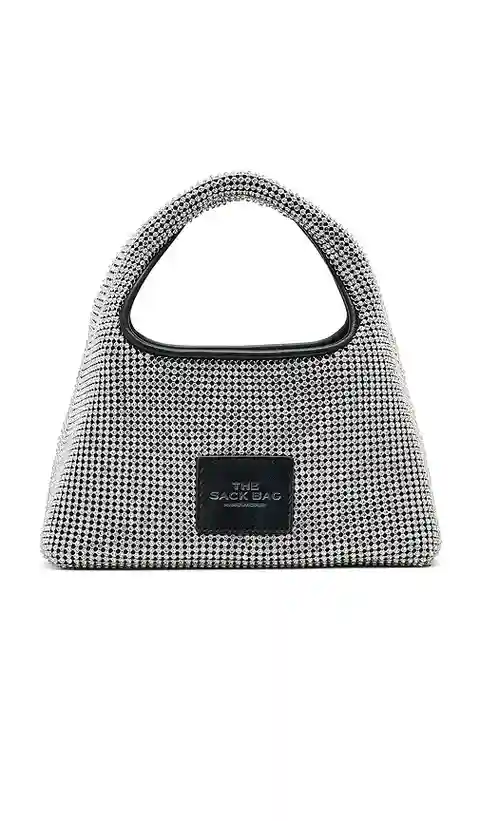 Marc Jacobs The Mini Sack in Metallic Silver. Marc Jacobs The Mini Sack in Metallic Silver. Crystal embellished exterior with faux leather lining. Made in Vietnam. Top magnetic button closure. One main compartment. Detachable interior zippered pouch. Integrated handle. Measures approx 8.66 W x 8.27 ...more