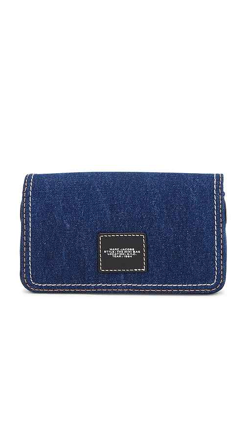 Marc Jacobs The Mini Bag in Denim-Dark. Marc Jacobs The Mini Bag in Denim-Dark. 100% cotton denim exterior with polyester lining. Made in Vietnam. Flap top with magnetic button closure and embroidered logo at front. One main compartment. 8 interior card slots. Interior slip pocket. Detachable silver...more