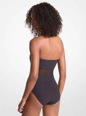 This bandeau swimsuit is elegant and eye-catching in equal measure. A mesh panel creates a striking two-piece effect, while a tonal logo belt encircles the waist. Wear it poolside with statement earrings.