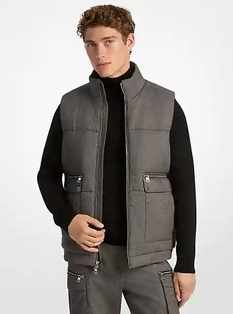 This puffer vest combines classic menswear styling with contemporary functionality thanks to its micro-houndstooth pattern and utility-inspired details. Crafted from 100% cotton, it features a quilted construction for lightweight warmth and multiple zip pockets for practical storage. The sleeveless ...more