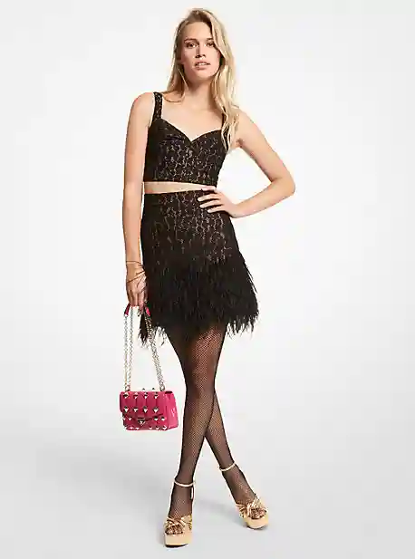 Corded lace details accentuate the leopard pattern on this eye-catching mini skirt while feather embroidery along the hem adds playful movement and texture. Create an enviable (and effortless) party look by pairing it with the coordinating top.