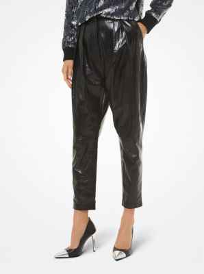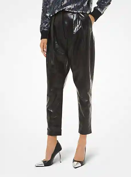 These high-rise pants strike an edgy note in glossy leather while the pleated front and tapered silhouette ensure polished sophistication. Finished with an ankle-length hem this pair is the perfect partner to stilettos and sneakers alike. Style them with a sequined top for a party-ready ensemble or ...more