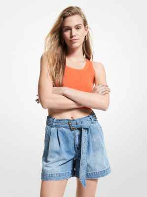 A detachable belt and ultra-flattering pleats make these denim shorts a refined warm-weather staple. Designed to sit slightly above the natural waist this pair will look equally chic with a cropped tank or button-up shirt.