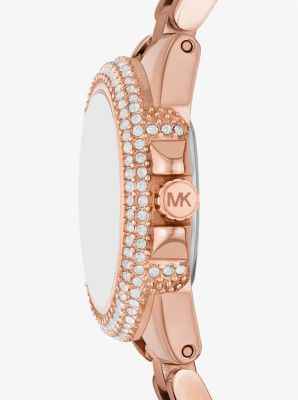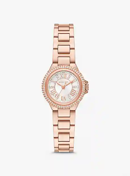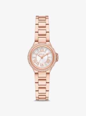 Lights camera Camille. Make an entrance in our bedazzled mini take on one of fashions favorite watches. Finished with a sprinkling of pav stones this fabulously functional statement piece features traditional Roman numerals and a rose gold-tone bracelet strap. Slip it on with your favorite on-duty f...more