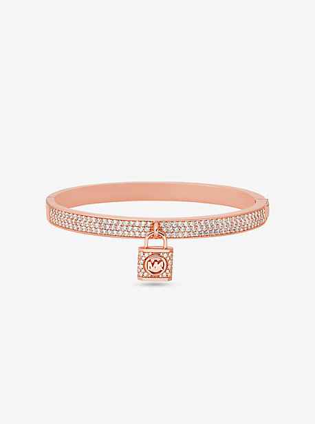 Inspired by the hardware on our beloved Hamilton bag, this 14K rose gold-plated bangle bracelet is dusted with three rows of pav and finished with a signature padlock charm. A hinged fastening makes it easy to slip on and off.