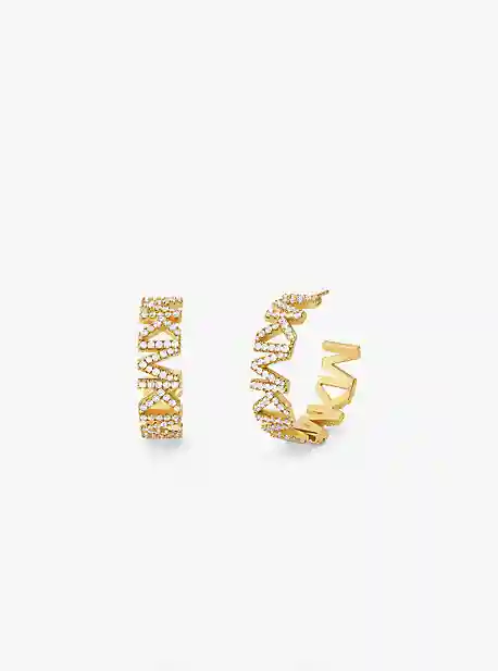 These brass hoop earrings give our logo a glamorous treatment with dazzling pav-encrusted MK charms. Plated in 14K gold theyre substantial in size with an open-ended silhouette. Wear your hair pulled back to keep them on full display.
