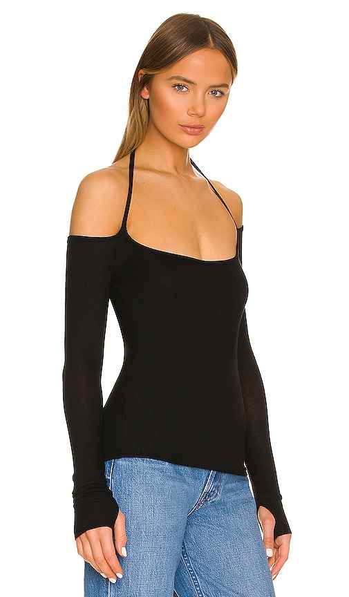 Michael Lauren Dave Halter Neck Top in Black. - size L (also in XS) Michael Lauren Dave Halter Neck Top in Black. - size L (also in XS) 95% siro viscose 5% spandex. Made in USA. Machine wash. Low scoop neck with halterneck accent strap. Off-shoulder sleeves with thumbhole details. Double lined ribbe...more