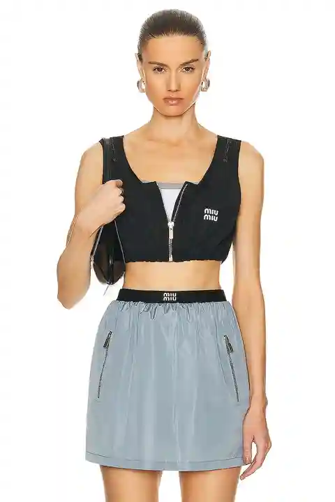 Miu Miu Cropped Tank Top in Black 76% recycled polyester 24% silk. Made in Italy. Dry clean only. Front zipper closure. Lightweight ripstop fabric. MIUF-WS115. MT1841. About the designer: Established in 1992 by Miuccia Prada, Miu Miu reflects fashion forward, light-hearted, and provocative women. Th...more