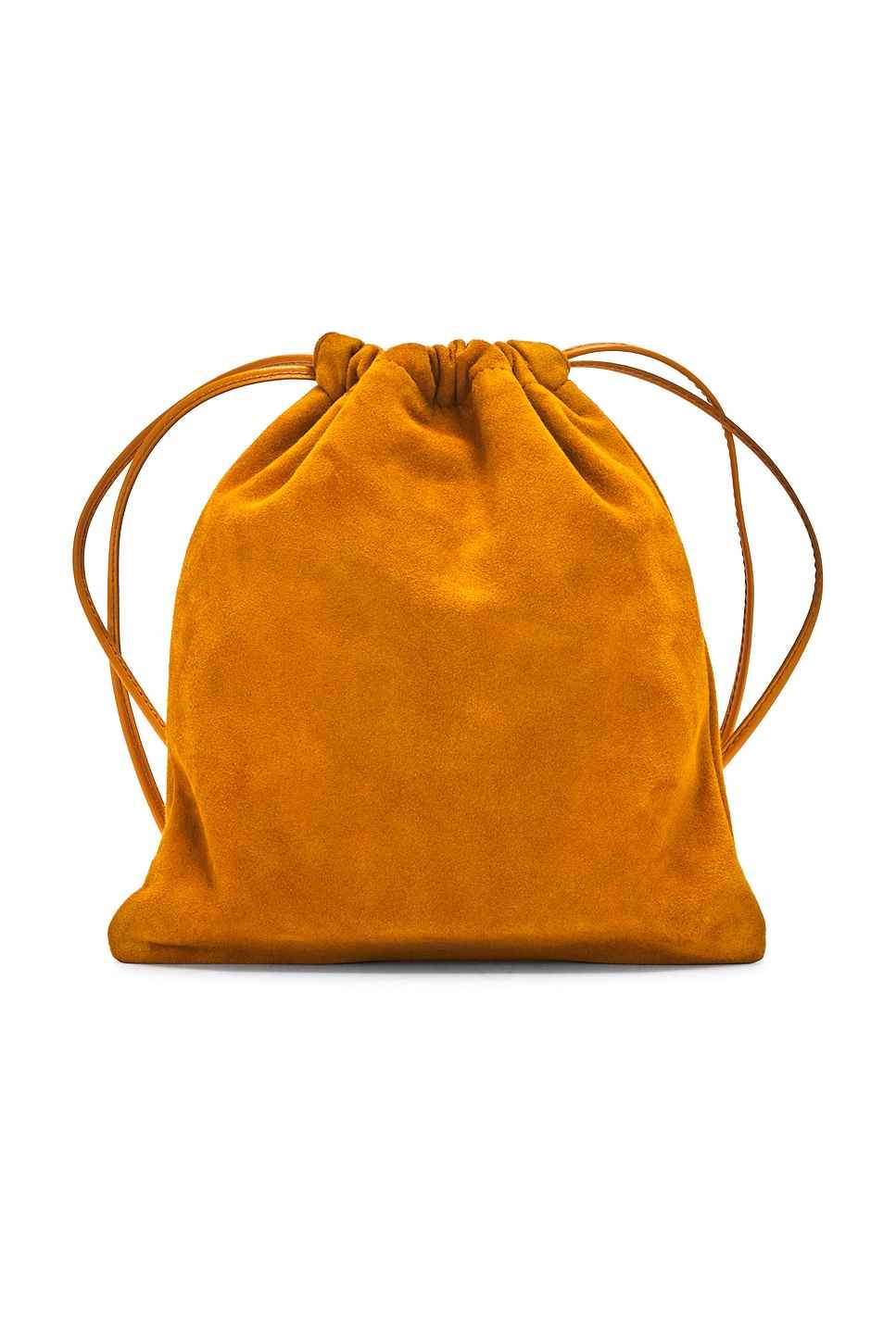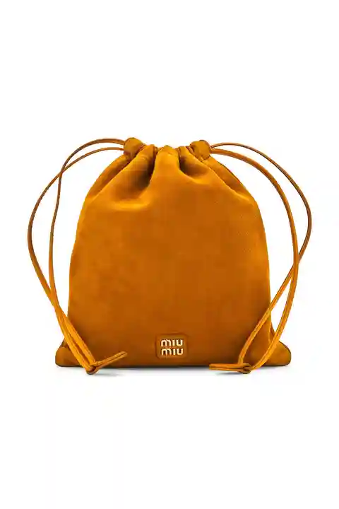 Miu Miu Camoscio Pouch in Tan Suede exterior with waterproof linen lining. Made in China. Drawstring closure. One main compartment. Measures approx 7 W x 8.26 H x 2 D. MIUF-WY139. 5NG010. About the designer: Established in 1992 by Miuccia Prada, Miu Miu reflects fashion forward, light-hearted, and p...more