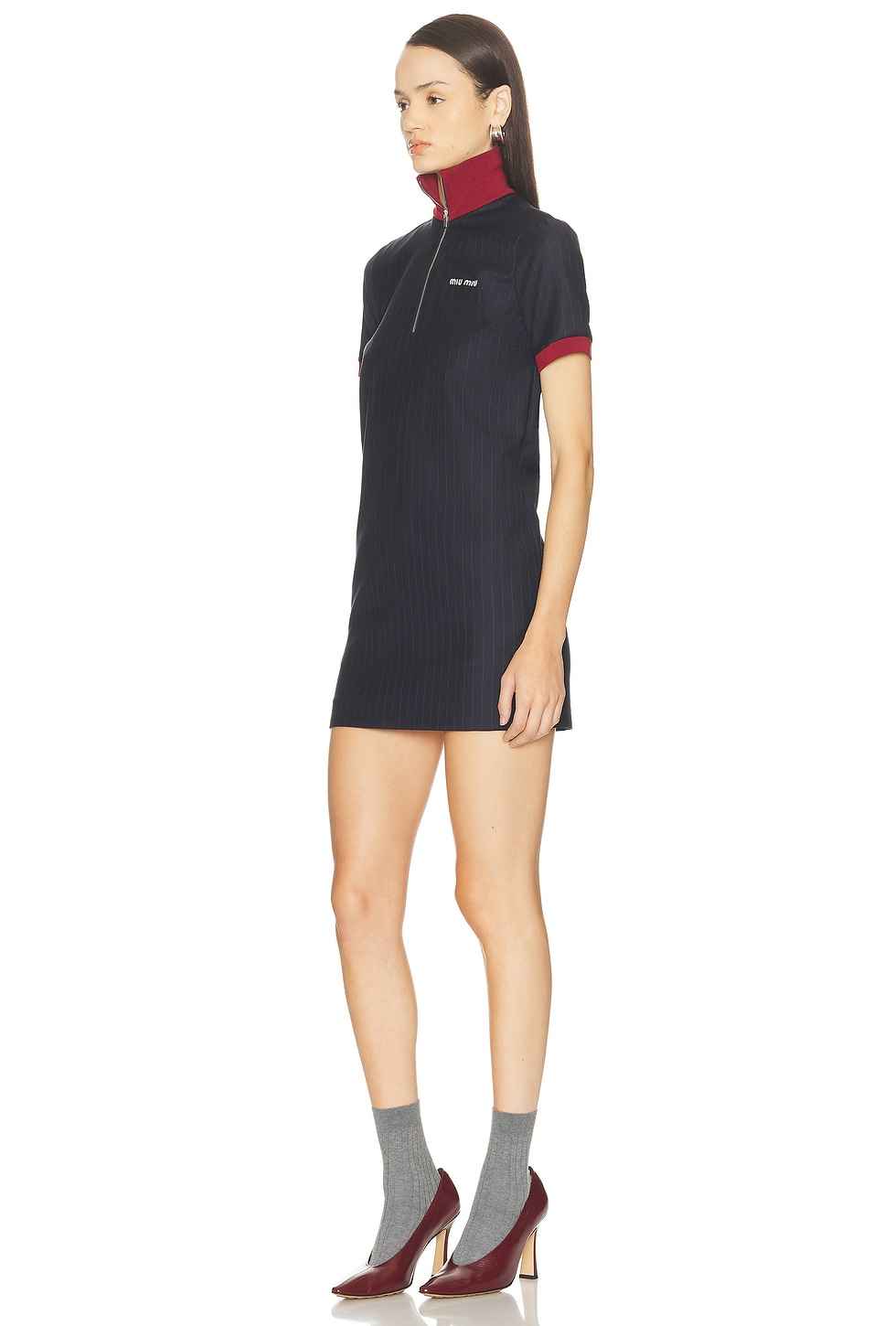 Miu Miu Short Sleeve Mini Dress in Navy Self: 100% virgin wool Lining: 100% polyester. Dry clean only. Fully lined. Exposed front partial zipper closure. Stand collar design. Breast logo embroidered detail. Side slit pockets. Twill fabric. MIUF-WD71. MF5998. About the designer: Established in 1992 b...more