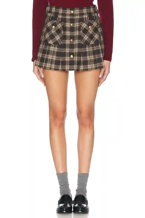 Miu Miu Pleated Mini Skirt in Tan 100% virgin wool. Made in Italy. Dry clean only. Unlined. Front button closure. MIUF-WQ72. MG2358-16DO. About the designer: Established in 1992 by Miuccia Prada, Miu Miu reflects fashion forward, light-hearted, and provocative women. The language of Miu Miu experime...more