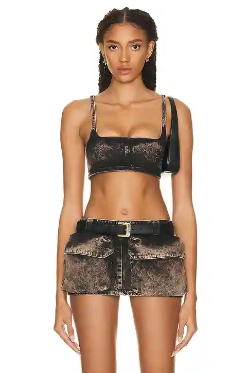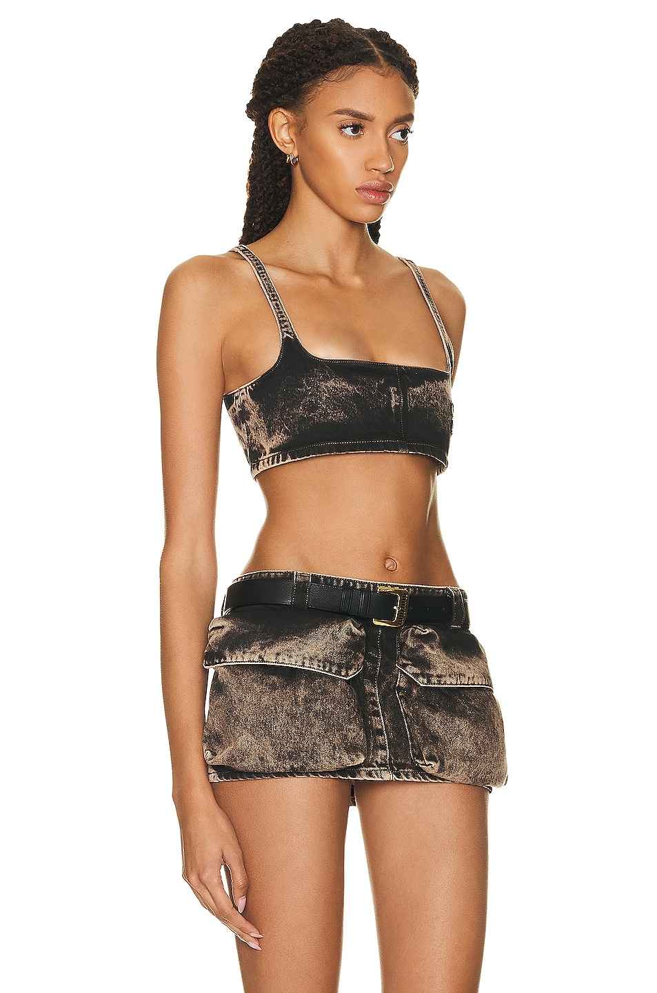 Miu Miu Denim Bralette Top in Brown 100% cotton. Made in Italy. Dry clean only. Embroidered logo at breast. Heavy fading detail. Item not sold as a set. MIUF-WS78. GWT042-121H. About the designer: Established in 1992 by Miuccia Prada, Miu Miu reflects fashion forward, light-hearted, and provocative ...more