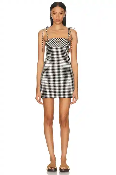 Miu Miu Mini Dress in Black Self & Lining: 100% cotton. Dry clean only. Fully lined. Hidden side zipper closure. Adjustable tie-up shoulder straps. Front logo detail. Side slit pockets. Crepe fabric. MIUF-WD66. MF5860. About the designer: Established in 1992 by Miuccia Prada, Miu Miu reflects fashio...more